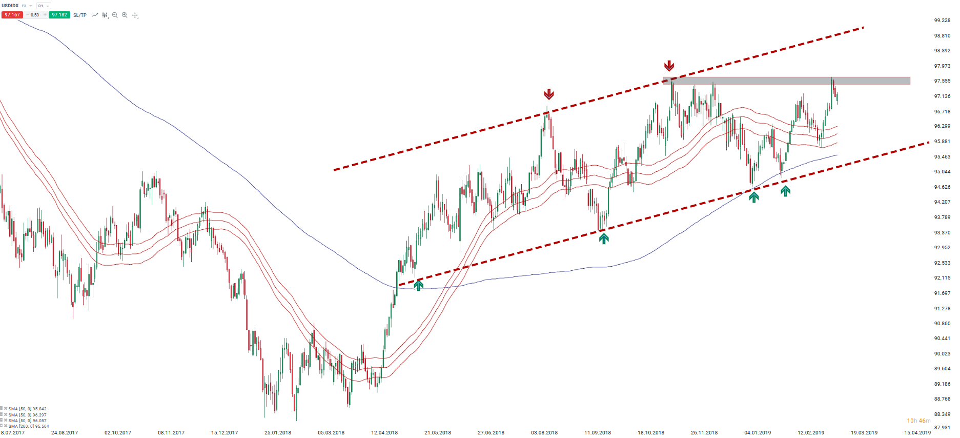 Na rynku walutowym, dolar ponownie próbuje atakować nowe maksima. W związku z tym, warto zwrócić uwagę na notowania indeksu dolara (USDIDX), który znajduje się w kanale wzrostowym od połowy 2018 roku. Słabszy odczyt zatrudnienia w sektorze pozarolniczym w piątek spowodował realizację zysków z długich pozycji na amerykańskim dolarze, jednak najważniejsza waluta cały czas pozostaje blisko zeszłorocznych szczytów. Wybicie poziomu 97,8 może zwiastować powrót w okolice górnego ograniczenia kanału wzrostowego, które obecnie przebiega w okolicach 99 punktów. Wsparciem dla byków pozostają okolice średniej 200-sesyjnej oraz dolnego ograniczenia, które powstrzymały spadki na początku roku.