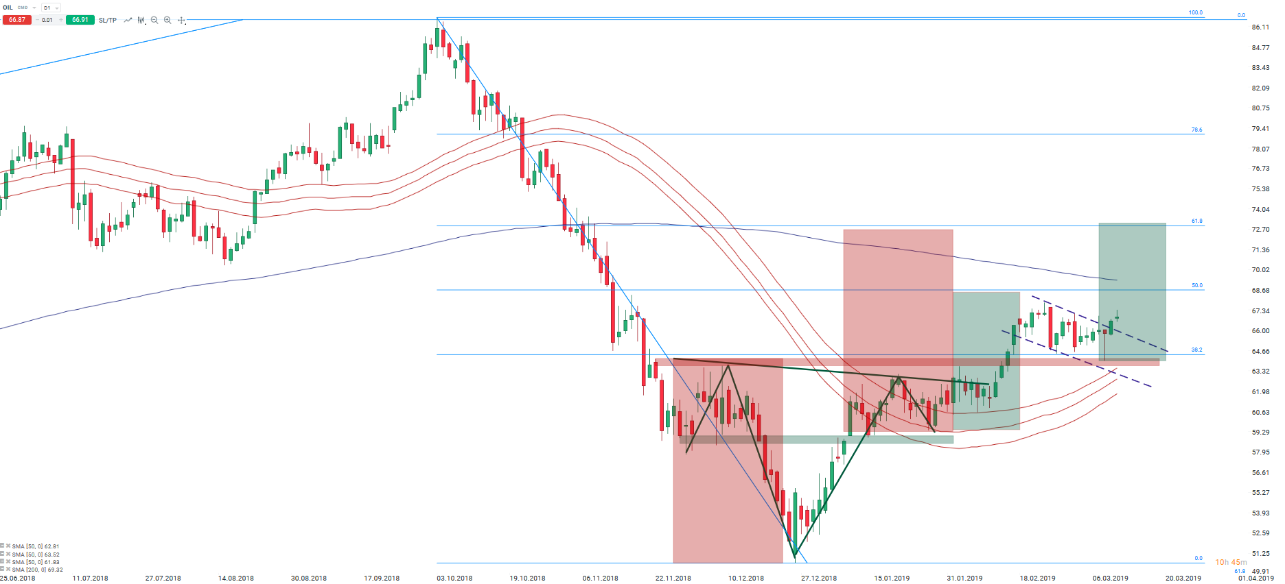 W bieżącym tygodniu warto zwrócić uwagę także na ropę naftową. Baryłka ropy Brent (OIL) pozostaje cały czas w trendzie wzrostowym od grudniowego dołka, a ostatnia konsolidacja przybrała formację flagi, która zwiastuje możliwą kontynuację trendu. Potencjalnym zasięgiem wybicia są okolice nawet 73$ za baryłkę (zielone prostokąty). Ten poziom pokrywa się również z zasięgiem wybicia z formacji odwróconej głowy z ramionami (czerwone prostokąty). W tym miejscu znajduje się również zniesienie 61,8% całej jesiennej fali spadkowej. Po drodze przeszkodą dla byków będzie również średnia 200-sesyjna wraz ze zniesienie 50%, które znajduje się na poziomie 69$ za baryłkę.