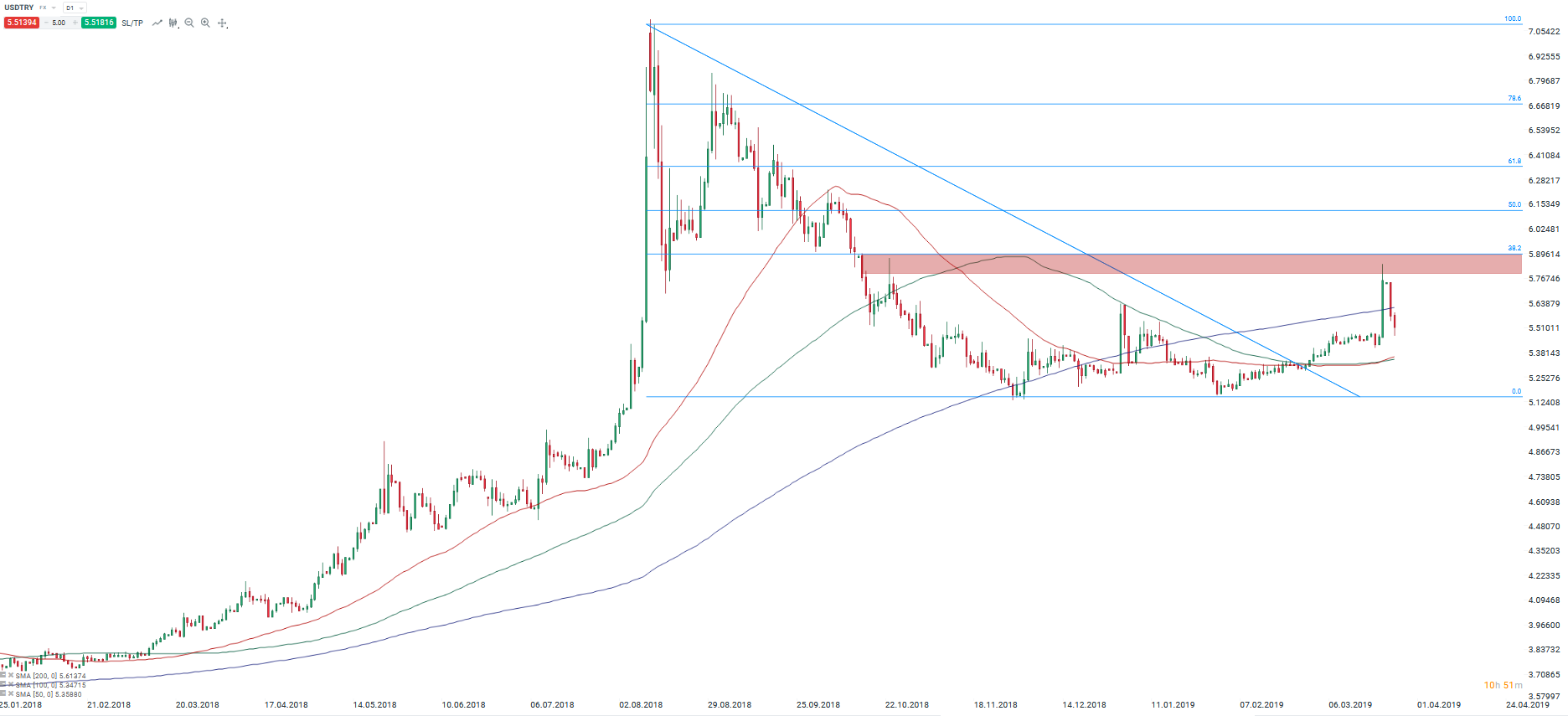 Pod koniec zeszłego tygodnia, mocne ruchy obserwowaliśmy na tureckiej lirze, która bardzo mocno traciła. Do głównych powodów takich ruchów można zaliczyć m.in.: ogólny wzrost awersji do ryzyka, raport JP Morgan, czy zbliżające się wybory lokalne, które odbędą się w najbliższą niedzielę. Już wcześniej mieliśmy do czynienia z silnymi jednodniowymi wyprzedażami, które miały miejsce podczas podobnych kumulacji negatywnych informacji dla liry i powodowały masową ucieczkę inwestorów, którzy korzystają na wysokich stopach procentowych w Turcji. Wcześniejsze wyprzedaże były jednak szybko negowane i podobnie jest tym razem. USDTRY nie potrafiło pokonać zniesienia 38,2% oraz lokalnych maksimów z jesieni 2018 roku. Gdyby ten poziom został pokonany, to z perspektywy technicznej droga do testu zeszłorocznych maksimów byłaby otwarta. Nic takiego się jednak nie stało, co potencjalnie może znów oznaczać konsolidację między poziomem 5,1 a 5,9.