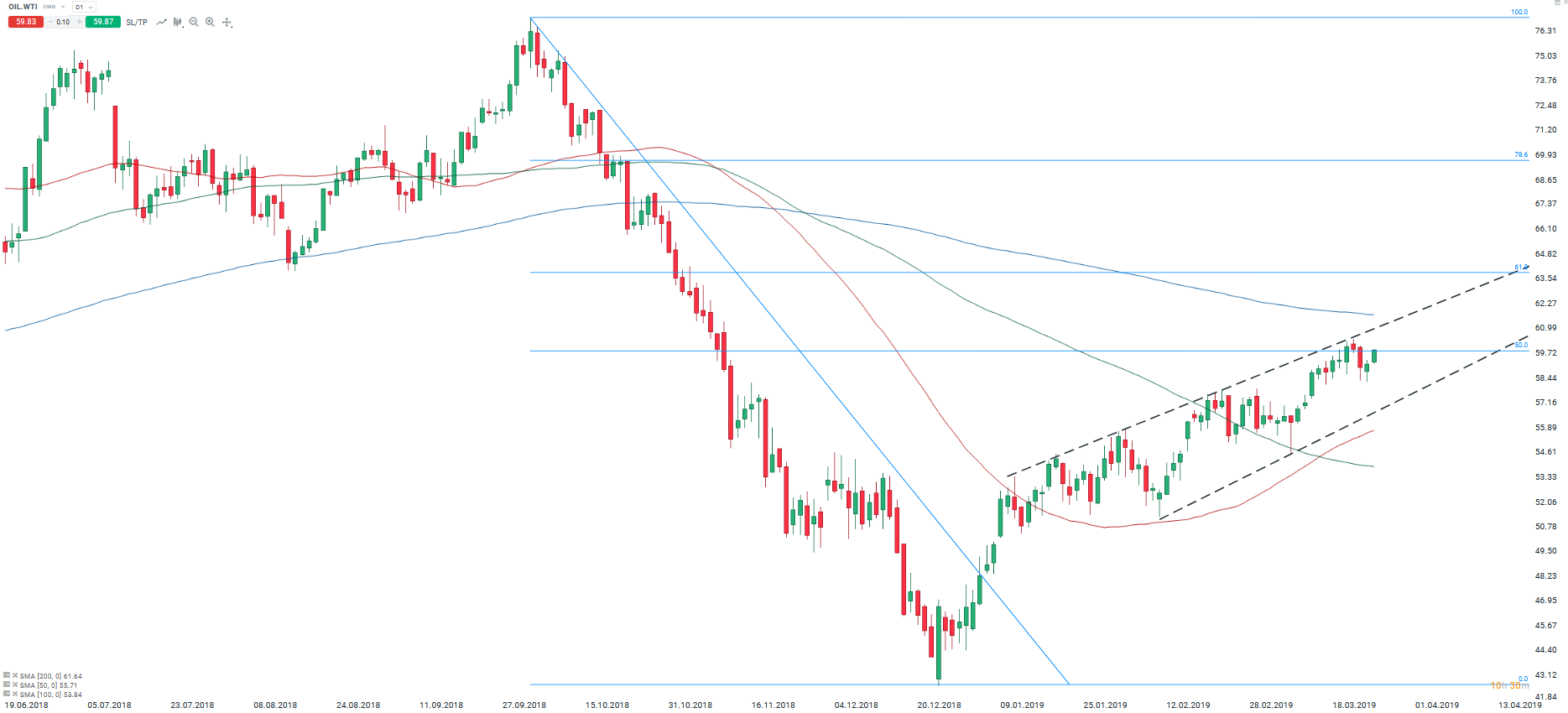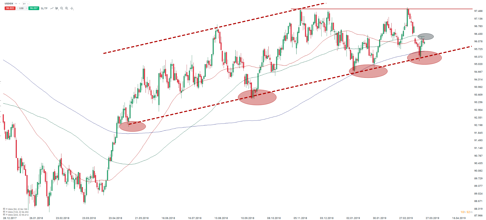 Miniony tydzień był bardzo ciekawy na amerykańskim dolarze, w związku z gołębim posiedzeniem Rezerwy Federalnej. Amerykańscy bankierzy zapowiedzieli brak podwyżek stóp procentowych w 2019 roku oraz zakończenie procesu zacieśniania bilansu, co spowodowało odwrót inwestorów od amerykańskiej waluty. Chwile słabości nie trwały jednak zbyt długo i dolar ponownie zyskał po wzroście awersji do ryzyka, którą obserwowaliśmy po bardzo słabych odczytach PMI ze strefy euro oraz odwróceniu się krzywej rentowności amerykańskich obligacji. W ujęciu technicznym, indeks dolara (USDIDX) ponownie odbija od dolnego ograniczenia kanału wzrostowego, który wcześniej powstrzymywał przed głębszymi spadkami. Warto jednak zauważyć, że szczyty z zeszłego roku zostały wybite tylko nieznacznie i rynek ponownie skierował się w kierunku wzrostowej linii trendu, co może dawać nadzieję niedźwiedziom, że w średnim terminie trend na amerykańskiej walucie ulegnie odwróceniu. Wsparciem bez zmian pozostaje linia trendu wzrostowego wraz ze średnią 200-sesyjną, a jej wyłamaniem głównym sygnałem do potencjalnej zmiany trendu.
