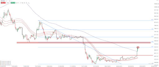 Na koniec warto zwrócić uwagę na bitcoina, który na początku miesiąca zaliczył bardzo mocny wzrost. Powodem nie były żadne istotne informacje, które mogłyby spowodować aż tak duży ruch w tak krótkim czasie. Wydaje się więc, że ostatnie wzrosty były spowodowane spekulacyjnymi plotkami, co daje nadzieję na kolejne duże ruchy w kolejnych dniach. Po ostatnim rajdzie bitcoin dotarł w rejon zniesienia 38,2% fali spadkowej od początku lipca 2018 roku. W tym rejonie mogliśmy zaobserwować pierwszą reakcję podaży, a w przypadku kontynuacji wzrostów kolejnym poziomem oporu będą okolice dopiero 5800$, gdzie znajduje się zniesienie 50% oraz lokalne minima z czerwca poprzedniego roku. Wsparciem obecnie powinny być rejony 4200$, skąd zaczął się dynamiczny ruch w ostatnim czasie.