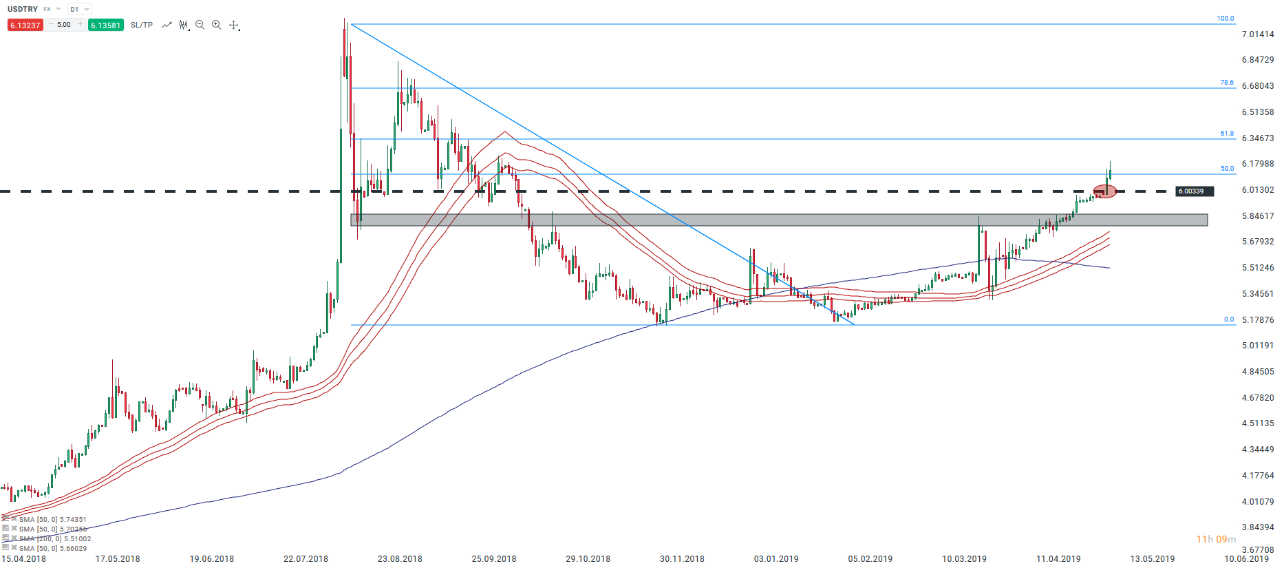 Kolejnym ciekawym tematem na ten tydzień jest turecka lira, która stoi u progu kolejnego kryzysu walutowego. Wczoraj komisja wyborcza zdecydowała o anulowaniu wyników wyborów w Stambule, które przegrała niewielką ilością głosów rządząca partia AK. Może to oznaczać kolejny kryzys polityczny w Turcji oraz możliwy atak spekulantów na lirę, tak jak to miało miejsce w okresie wakacyjnym poprzedniego roku. W ujęciu technicznym, lira traci już systematycznie od początku roku, jednak skala osłabienia przybrała na sile po wczorajszej decyzji. Wybita została psychologiczna bariera 6,00, a dzisiaj byki na parze USDTRY atakują zniesienie 50%. Jeśli ten poziom poniesie klęskę, to może oznaczać, że test 6,35 (zniesienie 61,8%), a następnie zeszłorocznych maksimów będzie bardzo prawdopodobny.