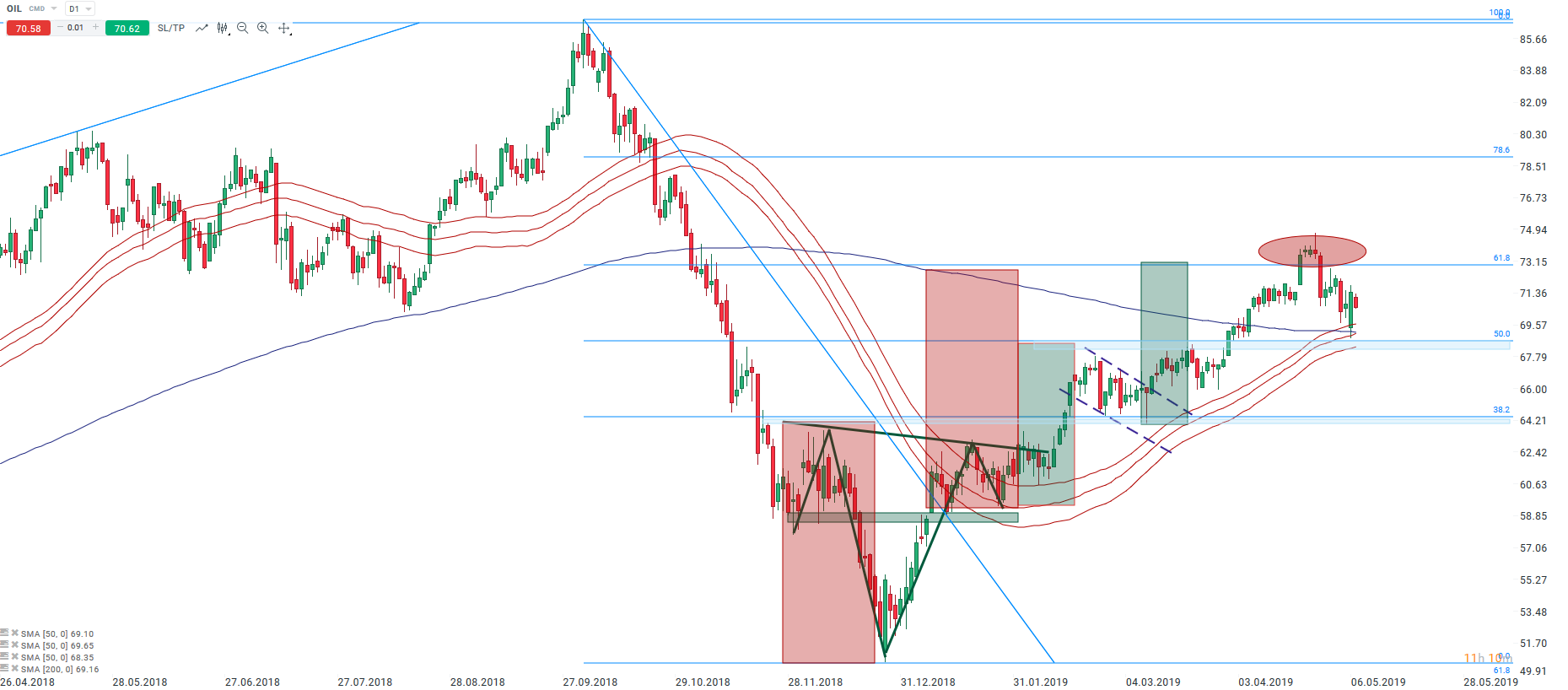 Z rynków surowcowych, warto zwrócić uwagę na ropę naftową (OIL). Zasięg wybicia z formacji odwróconej głowy z ramionami (czerwone prostokąty) oraz formacji flagi (zielone prostokąty) został zrealizowany z nawiązką, a rynek przetestował w tych okolicach zniesienie 61,8% całej fali spadkowej z zeszłego roku. Ropa po tym zaczęła tracić w związku z tym, że zaczęły pojawiać się głosy, że wprowadzenie “twardych” sankcji na Iran, może nie ograniczyć tak mocno eksportu z tego kraju, jak tego oczekiwano wcześniej. Notowania “czarnego złota” wróciły w rejon średniej 200-sesyjnej oraz kanału średnich 50-okresowych, które wraz z lokalnymi maksimami z pierwszej połowy roku powinny stanowić istotne wsparcie. Jego wybicie powinno być dopiero pierwszym sygnałem do zakończenia fali wzrostowej od początku roku. Kolejnym poziomem wsparcia powinny być dopiero okolice 64,2$ za baryłkę, gdzie znajdują się istotne poziomy z końcówki 2018 oraz początku 2019 roku.