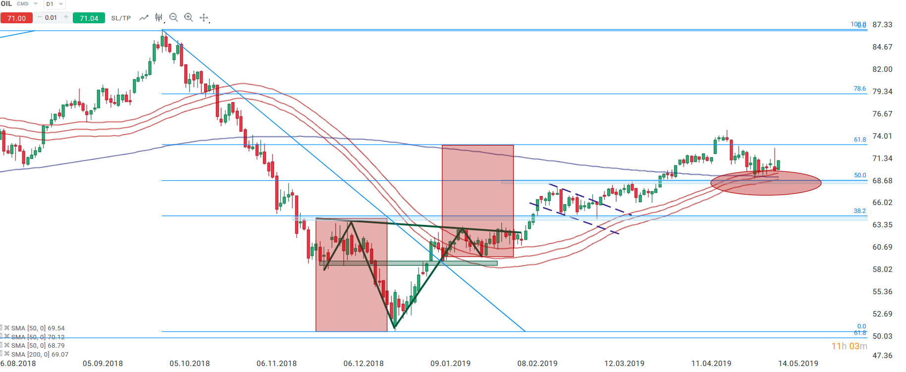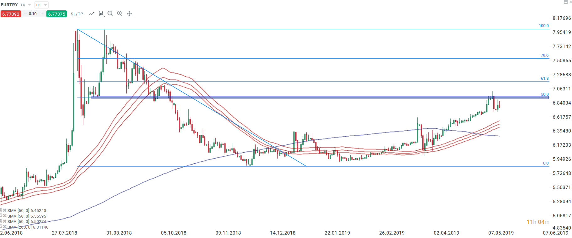 Ostatnim rynkiem, na którym dużo się dzieje jest turecka lira. Duże ruchy zaczęły się po anulowaniu wyników wyborów samorządowych w Stambule, gdzie “o włos” przegrała rządząca partia AK. Spowodowało to wyprzedaż liry, która napędzana była obawami o stabilność polityczną, co stwarza ryzyko kolejnego mocnego ataku spekulacyjnego na turecką walutę, tak jak to miało miejsce w ubiegłe wakacje. W międzyczasie bank centralny próbował bronić kursu i zawiesił transakcję repo, co zmusiło banki do pożyczek po wyższej stopie. W efekcie na wykresie dziennym EURTRY dotarliśmy do zniesienia 50% całej fali spadkowej od sierpnia 2018 roku, a istotność tego poziomu potwierdzają również lokalne minima z II połowy zeszłego roku. Jeśli ten poziom pęknie, to turecka lira może stać przed wyzwaniem utrzymania minimów z 2018 roku, a katalizatorem takiej sytuacji mogłoby być kolejne zaostrzenie relacji między USA a Turcją. Na ten moment obecne poziomy w przypadku ustabilizowania się sytuacji wydają się być dobrą okazją dla byków na tureckiej na lirze, jednak są obarczone bardzo dużym ryzykiem w przypadku dalszej eskalacji napięć.
