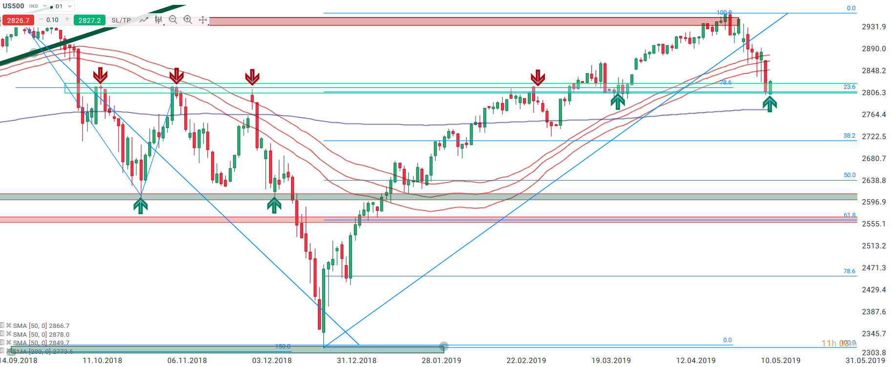 Początek tygodnia przynosi ponownie podwyższoną zmienność na światowych indeksach. Wątek handlowy cały czas jest główny czynnikiem cenotwórczym na rynkach finansowych i nie zanosi się na to, żeby ta sytuacja miała ulec zmianie w najbliższym czasie. Wczorajsza przecena na Wall Street spowodowała, że indeks S&P500 (US500) spadł w okolice wsparcia na poziomie 2800 punktów. Ten poziom wcześniej stanowił istotny punkt zwrotny w notowaniach amerykańskiego indeksu, a biorąc pod uwagę ostatnią przecenę istnieje szansa, że choć na chwilę powstrzyma on spadki tego benchmarku. Dodatkowo, wspierany jest on przez zniesienie 23,6% ostatniej fali wzrostowej. Niewiele niżej, bo na poziomie 2775 punktów zlokalizowana jest obecnie średnia 200-sesyjna, która również wcześniej działała jako wsparcie dla indeksu. W związku z tym byki stoją przed szansą na odreagowanie, a wsparciem dla takiego scenariusza mógłby być przynajmniej na chwilę brak kolejnych negatywnych doniesień w najbliższych dniach, w szczególności, że duża część “złych” informacji wydaje się chwilowo zdyskontowana przez rynki.