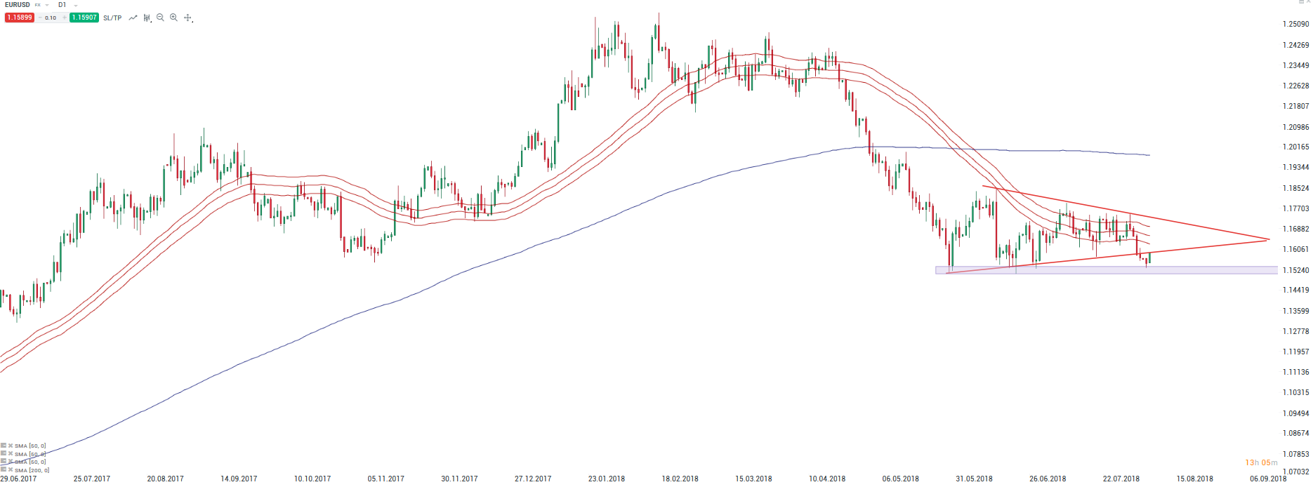 Kolejnym rynkiem, gdzie można oczekiwać w najbliższym czasie rozstrzygnięć jest EURUSD. Najważniejsza para walutowa po raz kolejny zbliżyła się do okrągłego poziomu 1,1500. Dodatkowo w ostatnich dniach obserwujemy wyjście dołem z potencjalnej formacji trójkąta, co biorąc pod uwagę ruch spadkowy z początku roku, może sugerować prawdopodobną kontynuację aprecjacji dolara amerykańskiego w stosunku do wspólnej waluty. Sytuację w kontekście tej pary walutowej warto rozpatrywać także przez pryzmat indeksu dolara (USDIDX), który ponownie walczy na oporze w okolicach 95 pkt.