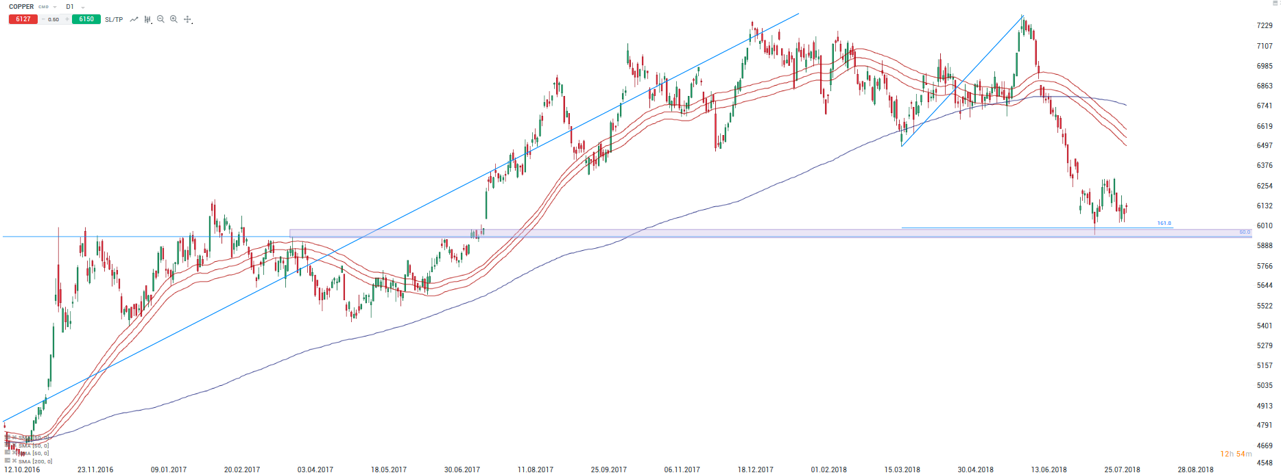 Na rynku surowcowym ciekawie wygląda miedź (COPPER). Ostatnie spadki zatrzymały się w okolicach węzła fibonacciego dwóch zniesień: 50% i 161,8%. Dodatkowo w rejonie 6000$ znajdują się także lokalne szczyty z początku 2017 roku, co wzmacnia psychologiczną wymowę tego poziomu. Czynnikiem sprzyjającym odbiciu na rynku surowców z pewnością byłaby większa korekta na dolarze amerykańskim. Dodatkowo w ostatnim czasie coraz lepiej radzą sobie rynki wschodzące, które są mocniej uzależnione od metali przemysłowych. Z perspektywy krótkoterminowej widzimy, że byki próbują bronić ostatnich minimów i obecnie stoją przed wyzwaniem wyrysowania wyższego dołka. Jeżeli ta sztuka im się uda, to perspektywa dla notowań miedzi w najbliższych tygodniach wydaje się być obiecująca.