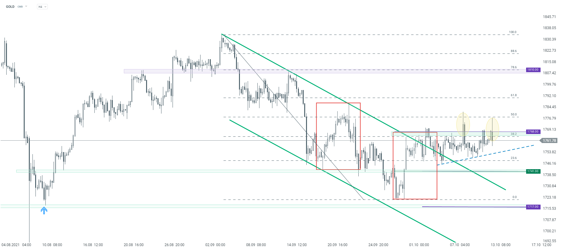 Przejdźmy do analizy rynku złota. Metal szlachetny wybił się dziś powyżej kluczowej strefy oporu w pobliżu 1 768 USD, jednak ponownie jak w miniony piątek, doszło do szybkiego cofnięcia. Zgodnie z metodologią Overbalance, tak długo jak cena znajduje poniżej górnego ograniczenia struktury 1:1 (czerwony prostokąt), niedźwiedzie mają przewagę. Biorąc to pod uwagę, ruch w kierunku obszaru wsparcia 1741 USD jest możliwy. Z drugiej strony, jeśli cena wróci i utrzyma się powyżej wspomnianego obszaru 1768 USD, ruch wzrostowy może się rozszerzyć nawet w kierunku strefy oporu przy 1810$. Wcześniej sprzedający powinni również zwrócić uwagę na mierzenia 50% i 61,8% Fibonacciego impulsu spadkowego, który rozpoczął się na początku września.