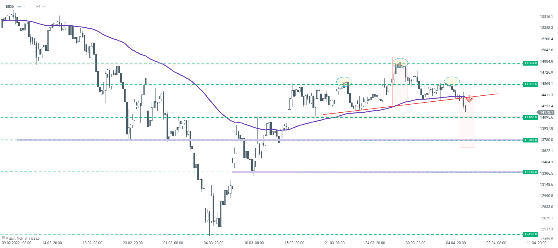 Rozpocznijmy dzisiejszą analizę od niemieckiego DAX (DE30). Patrząc na interwał H4, można zauważyć, że na wykresie pojawiła się formacja głowy z ramionami. Biorąc to pod uwagę, możliwa jest kontynuacja ruchu spadkowego. Zgodnie z klasyczną analizą techniczną, dopóki cena znajduje się poniżej linii szyi wspomnianej formacji (czerwona linia na poniższym wykresie), dopóty przewagę mają niedźwiedzie. W przypadku realizacji takiego scenariusza, najbliższe wsparcie można znaleźć na poziomie 14 100 pkt, gdzie znajdują się poprzednie reakcje cenowe. Z kolei w przypadku większej wyprzedaży, obszar 13 780 pkt powinien być traktowany jako kolejne ważne wsparcie.