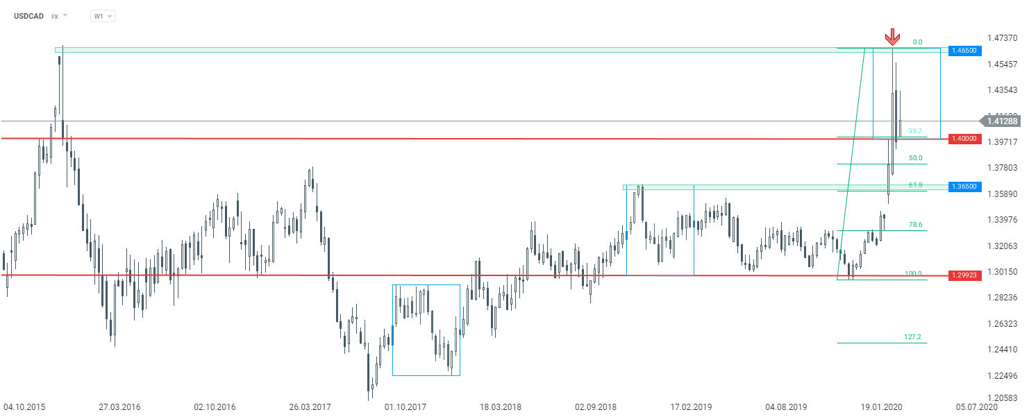 Na koniec przyjrzyjmy się sytuacji technicznej USDCAD. Spoglądając na miesięczny interwał, można dostrzec, iż od początku 2020 roku para walutowa znajduje się w silnym ruchu wzrostowym. W niecałe 3 miesiące kurs wzrósł o ponad 1 600 pipsów. Strona podażowa zatrzymała wzrosty na poziomie 1,4650 - maksimum z 2016 roku. Niemniej jednak, po gwałtownej korekcie para znalazła wsparcie przy dolnym ograniczeniu struktury Overbalance i nastąpiło odbicie. Poziom 1,4000 powinien być obecnie traktowany jako kluczowe wsparcie, a tak długo jak kurs znajduje się powyżej tej granicy, kontynuacja ruchu wzrostowego jest możliwa. Z drugiej strony, spadek poniżej 1,4000 może zwiastować większą korektę, a potencjalnym celem mógłby być poziom 1,3650 - maksimum z końca 2018 roku.