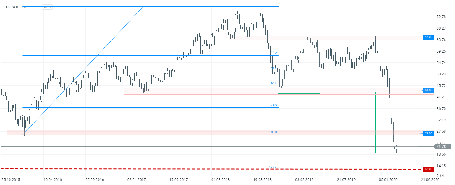 Ceny ropy naftowej doświadczyły największego załamania od blisko 30 lat. Choć największy spadek miał miejsce w drugim tygodniu marca, ruch w dół nadal jest kontynuowany. Patrząc na interwał W1, można dostrzec, że kupujący chcieli powstrzymać spadki na poziomie 27 USD, jednak wsparcie zostało ostatecznie przełamane. Zamknięcie tygodniowej świecy powyżej 27 USD można potraktować jako sygnał popytowy, co może zwiastować ruch do góry. W tym scenariuszu, korekta wzrostowa mogłaby sięgnąć nawet poziomu 44 USD. Cena ta jest wyznaczona poprzednimi reakcjami cenowymi i górnym ograniczeniem struktury Overbalance. Niemniej jednak, tak długo jak znajdujemy się poniżej granicy 27 USD, średnioterminowy trend pozostaje spadkowy, a dalsze spadki pozostają scenariuszem bazowym. Kluczowe wsparcie, które warto obecnie obserwować to 13 USD (zniesienie Fibo 127,2%).