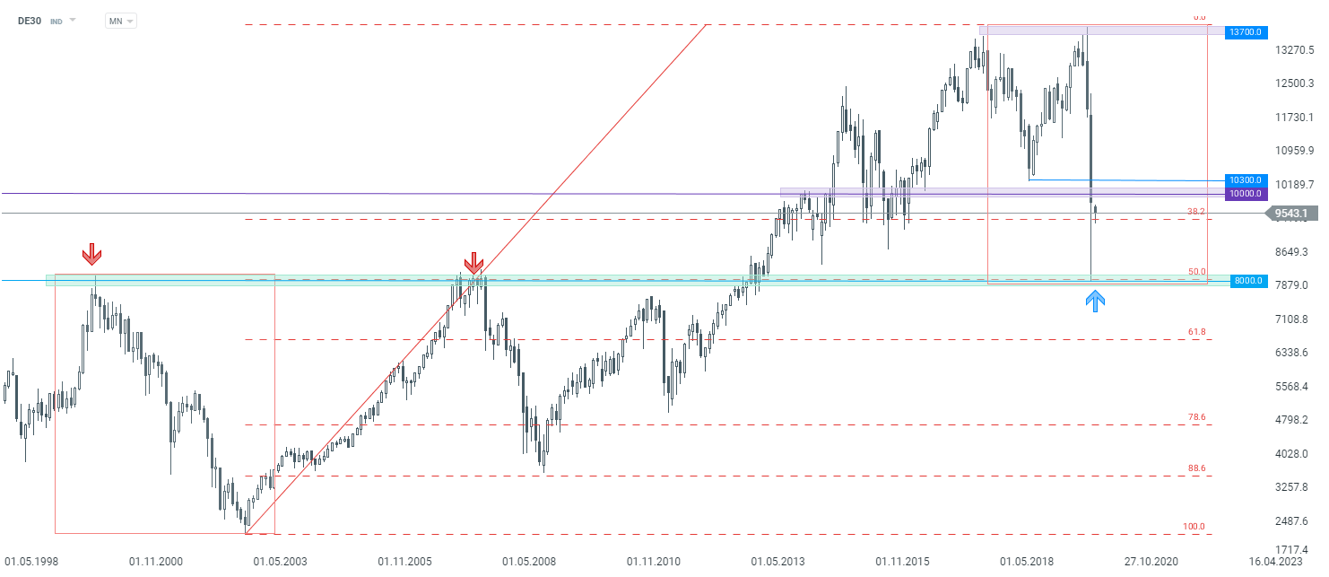 Zacznijmy dzisiejszą analizę od DAX’a (DE30). Niemiecki indeks doświadczył w poprzednim miesiącu ogromnej wyprzedaży. Pod koniec marca strona popytowa starała się wyprowadzić indeks do góry, jednak przeszkodą był poziom 10 000 punktów. Warto zauważyć, że pomimo ostatniej korekty, główny trend pozostaje spadkowy. Najbliższym oporem jest wspomniana wyżej granica 10 000 punktów. Dodajmy, że tak długo jak cena znajduje się poniżej 10 350 punktów, trwający ruch wzrostowy powinien być traktowany jedynie jako korekta. W przypadku dominacji ponurych nastrojów, DAX może wycofać się w kierunku poprzedniego minimum z okolic 8 000 punktów. Traderzy powinni pamiętać, że pandemia koronawirusa jest daleka od opanowania, zatem akcje są narażone na ryzyko dalszych spadków.