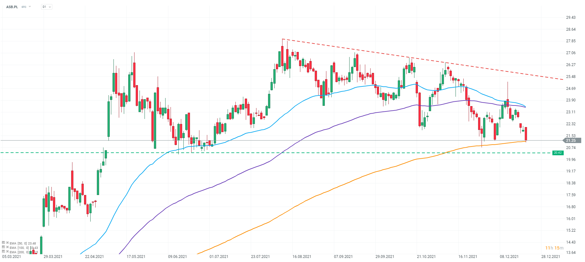 Wykres spółki ASBIS Enterprises Plc (ASB.PL), interwał D1. Ceny akcji poruszają w wyraźnym trendzie spadkowym, który dodatkowo wzmocniony jest przez niepełną formację trójkąta spadkowego. W przeciągu ostatnich dwóch tygodni walory firmy odbijały się od wsparcia wyznaczonego przez EMA 200 (złota linia). Presja na przełamanie dołem tego ograniczenia wydaje się nadal silna, dlatego najbliższe kilka sesji powinno rozwiązać niepewność co do dalszego kierunku notowań. Najbliższym poziomem oporu pozostaje lokalny szczyt, w okolicach 24 zł za akcję. Źródło: xStation 5