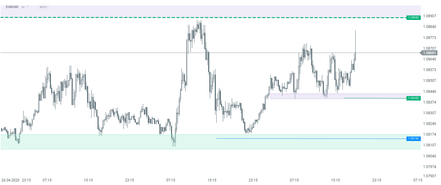 Zmienność na EURUSD jest przeciętna jeśli chodzi o tej rangi wydarzenie, tuż po godzinie 20:00 kurs skoczył niecałe 20 pipsów w górę. Żródło: xStation5