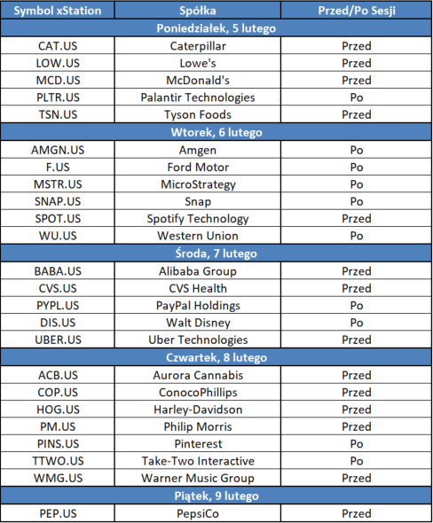 Sezon wyników finansowych na Wall Street trwa w najlepsze. Inwestorzy zapoznali się już z raportami największych amerykańskich spółek technologicznych, które były kluczowymi motorami wzrostów na giełdzie w 2023 roku. Nie oznacza to jednak, że nie ma już innych interesujących spółek do obserwacji. W kalendarzu wyników na ten tydzień można znaleźć 4 członków indeksu Dow Jones - Amgen (AMGN.US), Caterpillar (CAT.US), McDonald's (MCD.US) i Walt Disney (DIS.US), z których dwa raportują dzisiaj. Wśród najważniejszych wydarzeń tygodnia można również znaleźć raporty takich spółek jak Alibaba Group (BABA.US), Arm Holdings (ARM.US), Ford Motor (F.US) czy PepsiCo (PEP.US). Kalendarz najciekawszych raportów finansowych Wall Street zaplanowanych na ten tydzień można znaleźć w poniższej tabeli.