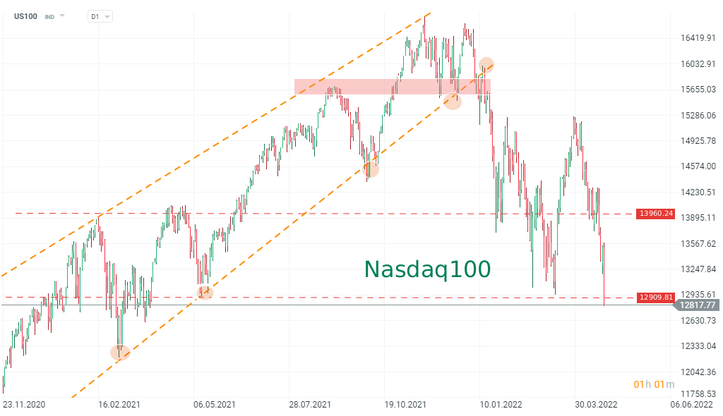 Pamiętajmy, że "oczekiwania" publikowane na Wall Street są zawsze zaniżane, szczególnie wobec spółek technologicznych. Dlatego jeśli Google podaje słabsze wyniki a Microsoft tylko minimalnie lepsze możemy mówić ogólnie o sporym rozczarowaniu. Wobec niesprzyjającego środowiska - zacieśnienie Fed, inflacja, możliwe spowolnienie, wojna na Ukrainie, wyniki spółek w USA były do tej pory ostatnim mocnym argumentem byków. Część publikacji (Apple, Facebook, Amazon) dopiero przed nami, ale na razie i ten argument zaczyna słabnąć. US100 poddaje kluczowe wsparcie na poziomie 12900 pkt. i notowany jest najniżej od marca ubiegłego roku. Co więcej, dzisiejsze ogromne spadki negują wczorajszą próbę odbicia od wspomnianego wsparcia.