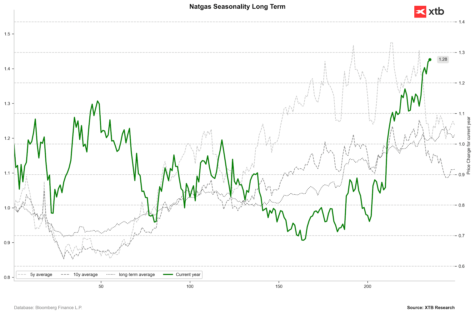 Cena zaliczyła bardzo mocny przyrost w ciągu ostatniego miesiąca i pozostaje wysoko względem historycznych standardów. Sezonowość pokazuje również na spadki w najbliższych kilkudziesięciu dniach, choć należy pamiętać, że po części wynika to również z samej struktury terminowej. Źródło: Bloomberg Finance LP, XTB