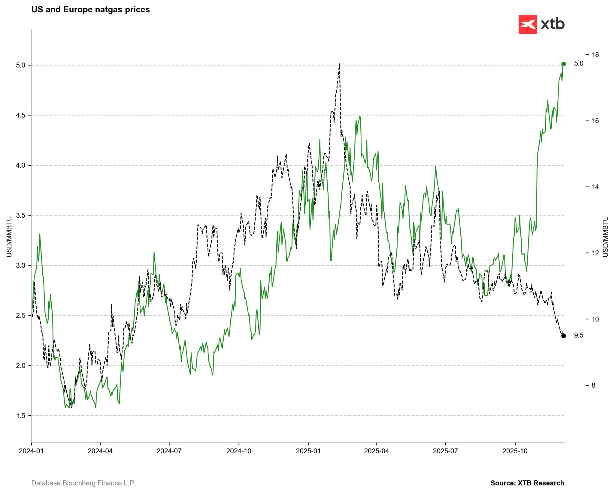 USA Cena Gazpowa Osiąga $5 (Highest since 2022): Gwałtowny wzrost cen gazu w USA, przekraczający $5/MMBTU, jest napędzany przez silny popyt na ogrzewanie wynikający z chłodniejszej pogody w Północnej Ameryce oraz wysoki eksport LNG.
