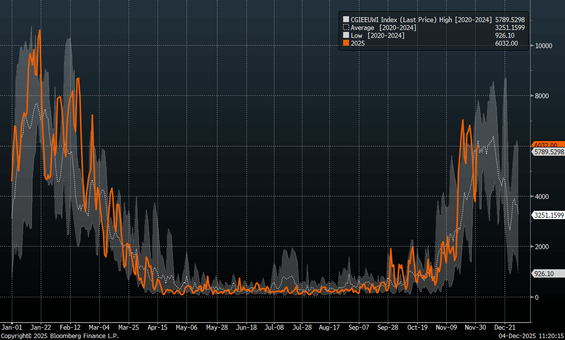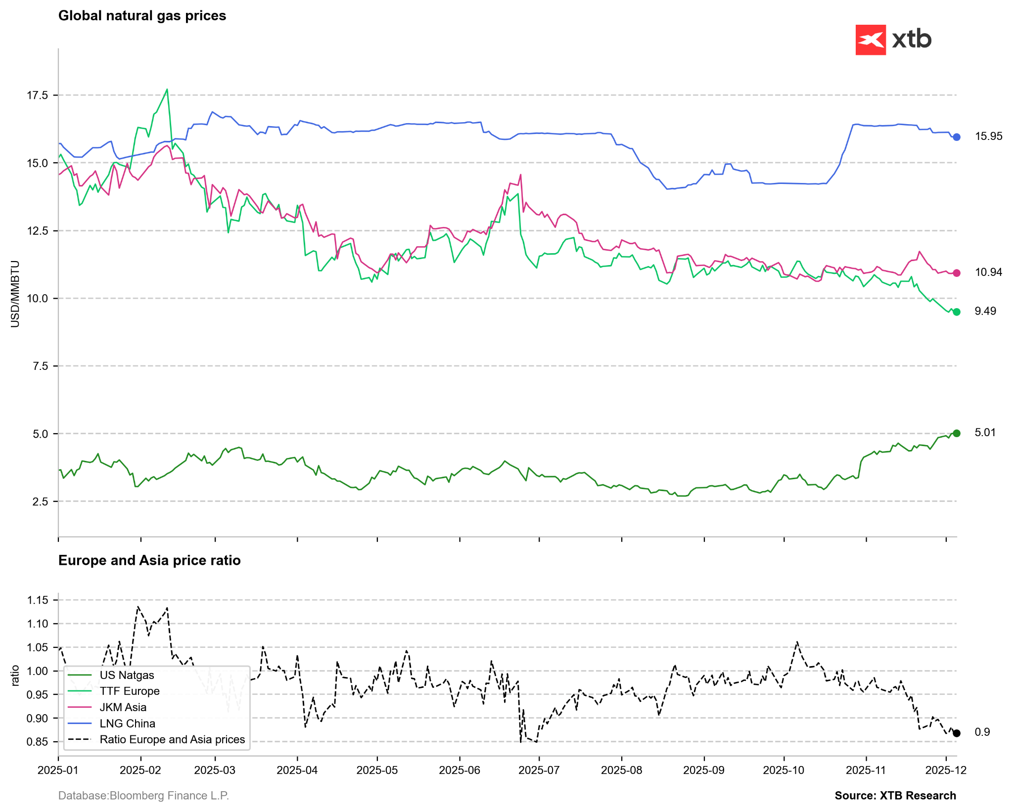 Ceny gazu zaliczyły potężny wzrost w listopadzie i wpływ ostatniego rolowania kontraktów terminowych był marginalny na zmianę cenową w poprzednim miesiącu. Po dwóch pierwszych mieszanych sesjach na początku grudnia, mocne wzrosty w środę doprowadziły do przebicia szczytów z marca 2025 roku i obecnie ceny notowane są najwyżej od 2022 roku, przekraczając na moment granicę 5 USD/MMBTU. Co stoi za mocnym wzrostem cen gazu i czego można oczekiwać po najbliższej przyszłości?