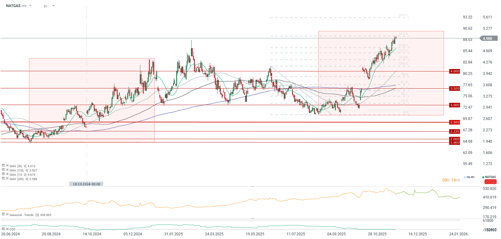 Cena sięga obecnie poziomu 5 USD/MMBTU, który zbiega się ze zniesieniem 161.8 ostatniej dużej fali spadkowej. Cena wspierana jest przez 14 okresową średnią jako ważne, krótkoterminowe wsparcie. Warto zauważyć, że obecny schemat wzrostów wygląda bardzo podobnie do zeszłego rocznego, choć jednocześnie obecnie odnotowujemy większe zużycie gazu niż w tym samym okresie w zeszłym roku. Zakres wzrostu sugeruje, że szczyt może być odnotowany w drugiej połowie stycznia. Jeśli jednak zużycie gazu podskoczy jeszcze mocniej w styczniu lub lutym, cena może znaleźć się zdecydowanie wyżej niż obecnie i powtórzyć sytuację z 2022 roku, choć prawdopodobnie w nieco ograniczonej skali.