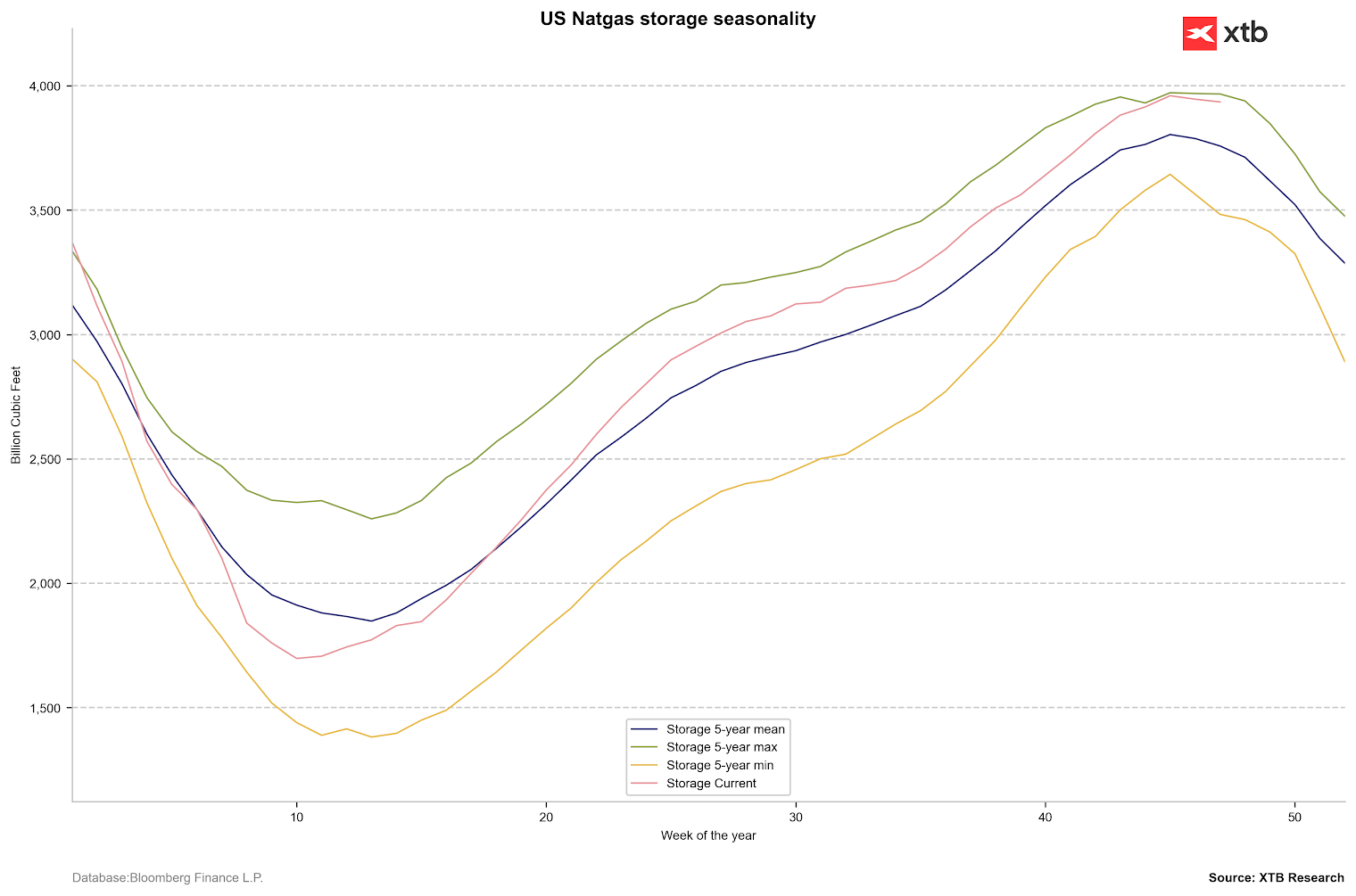 Niemniej niskie temperatury doprowadziły do skokowego przyrostu popytu, a dodatkowo eksport gazu LNG pozostaje bardzo wysoki, bliski 100% możliwościom przesyłowym. Nawet przy bardzo wysokiej podaży, która przekroczyła 120 bcfd, implikowana zmiana zapasów wskazuje na spadek zapasów na poziomie 200 bcf, co nie jest standardem jak na ten okres w roku. Zazwyczaj tak duże spadki miały miejsce w styczniu lub w lutym. Źródło: Bloomberg Finance LP, XTB