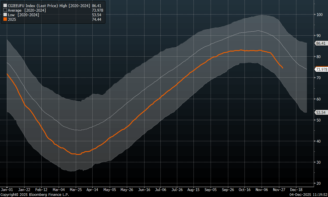 Cena osiągała lokalny szczyt zazwyczaj w końcówce listopada, a później ceny zaliczały korektę. Warto pamiętać, że w listopadzie mieliśmy ostatnie rolowanie związane z contango, a obecnie cena znajduje się w kilku miesięcznym backwardation. Cena może wydawać się nadmiernie wysoko względem historycznych standardów, ale dopóki wysokie zużycie gazu będzie kontynuowane, cena może pozostać na podwyższonym poziomie. Jeśli implikowany popyt spadnie do zakresu 120-140 bcfd powinien być to sygnał również do odwrotu cenowego.