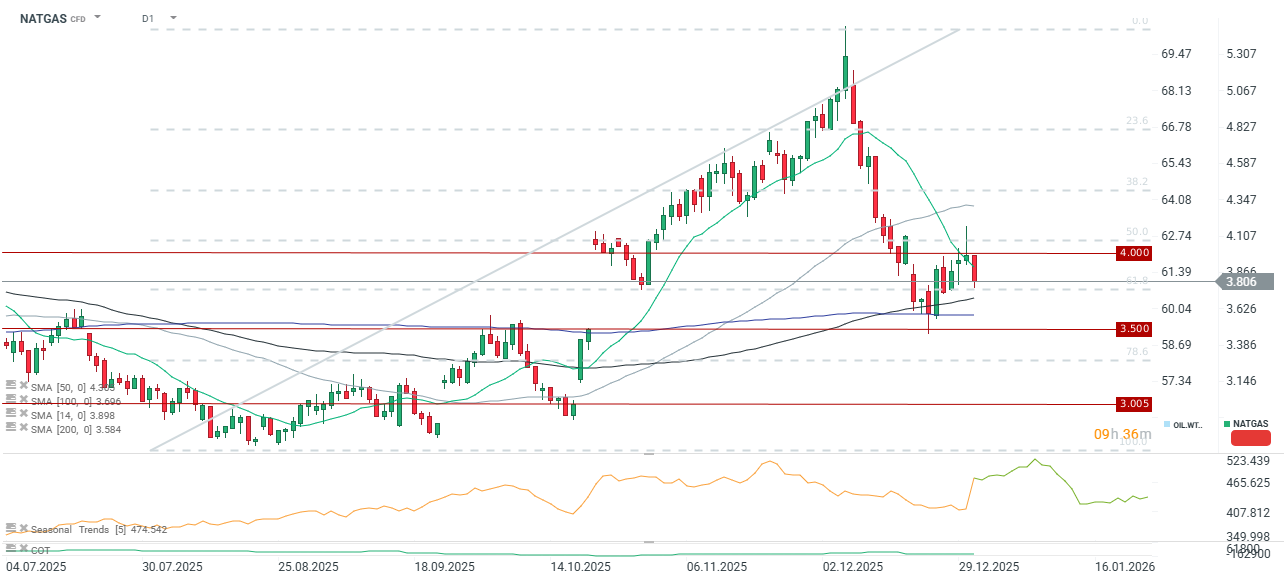 Cena gazu ziemnego w USA cofa się w ostatnią sesję tego roku, co może być związane z realizacją zysków po odbiciu, które miało miejsce od lokalnego dołka zanotowanego 22 grudnia. Warto podkreślić, że przez pierwsze trzy tygodnie grudnia mieliśmy spadki zapasów o ponad 160 bcf, co jest niezwykle rzadkie jak na grudzień. Dzięki ostatniemu raportowi o zapasach do 19 grudnia, zapasy spadły pierwszy raz poniżj 5 letniej średniej od kwietnia. Z drugiej strony końcówka grudnia była już ciepła i takie temperatury mają utrzymać się przynajmniej do 13 stycznia. To oznacza, że spadki zapasów przez 3 najbliższe raporty nie powinny być już zbyt duże.