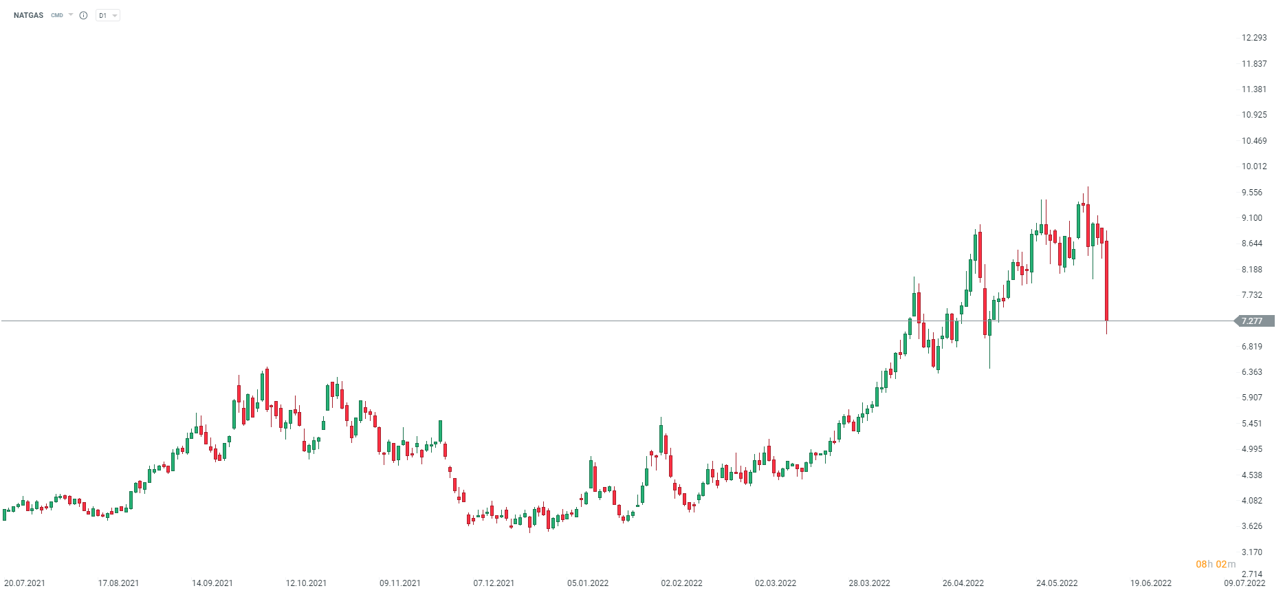 Natgas traci dzisiaj ponad 17% swojej wartości. Jeśli cena nie powróci dzisiaj do zakresu 7,8-8,0 USD MMBTU, może to oznaczać potencjalne zejście do lokalnego dołka przed okresem grzewczym w okolice 6,0-6,2 USD MMBTU. Źródło: xStation5
