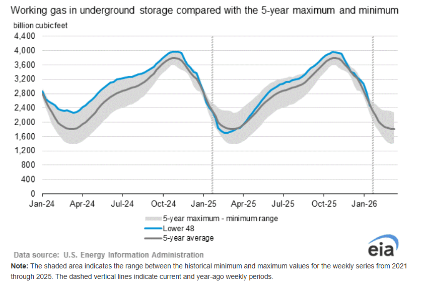 - Zmiana prognoz pogodowych: Po okresie arktycznych mrozów w styczniu, modele meteorologiczne wskazują na ocieplenie w kluczowych regionach USA (np. Midwest i Northeast), co ogranicza zużycie gazu do generacji ciepła