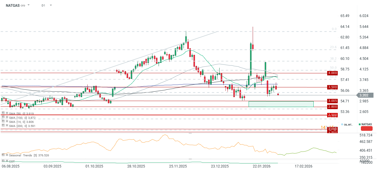 Cena gazu ziemnego cofa się na otwarciu nowego tygodnia o ponad 6%. Biorąc pod uwagę szczyt z zeszłęgo tygodnia z piątku, cena jest obecnie niżej aż o 12%. Obecnie testowane są okolice 3,2 USD/MMBTU, czyli lokalne dołki z poczatku poprzedniego tygodnia. Jeśli wsparcie to zostanie przełamane, cena znajdzie sie najniżej od połowy stycznia, z perspektywą zejśćia do silnej strefy popytowej w okolicach 2,8-3,0 USD/MMBTU.