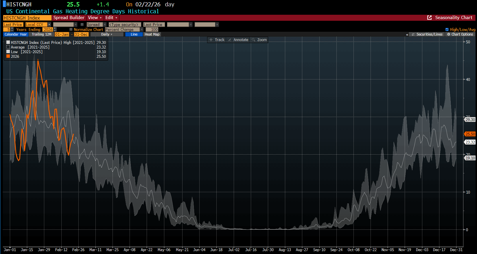 Prognozowana liczba stopniodni grzewczych na 22 lutego wzrosła do okolic 5 letniej średniej. Niemniej sezonowość pokazuje na wyraźne zmniejszenie potrzeb grzewczych w drugiej połowie lutego. Źródło: Bloomberg Finance LP