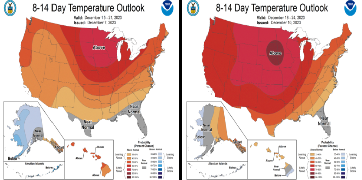 Nowe prognozy na okres 8–14 dni do przodu (mapa po prawej) wskazują na ponadprzeciętne temperatury w większej części Stanów Zjednoczonych niż prognozy sprzed weekendu (mapa po lewej). Źródło: Bloomberg Finance LP