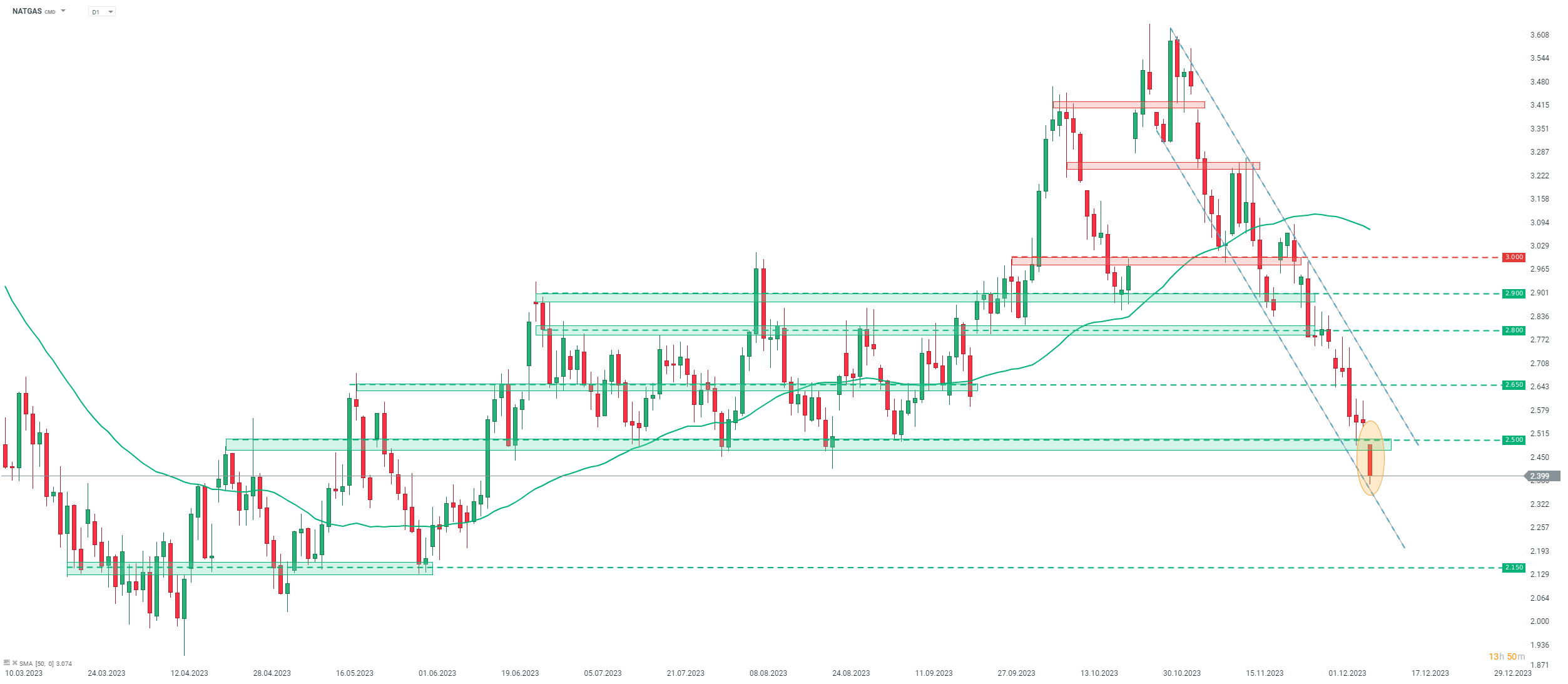 Patrząc na wykres NATGAS w odstępie D1, widzimy, że cena porusza się w bardzo stromym trendzie spadkowym. Co więcej przełamane zostało wsparcie na poziomie 2,5 USD/MMBTU i obecnie testowane są najniższe poziomy z połowy czerwca. Cofnięcie wytraciło swój impet po rozpoczęciu handlu w Europie, ale byki cały czas nie przejęły kontroli. Jeśli sprzedający powrócą na rynek, np. w trakcie początku sesji amerykańskiej, wtedy kolejnym ważnym poziomem do obserwacji będzie wsparcie przy poziomie 2,15 USD/MMBTU.