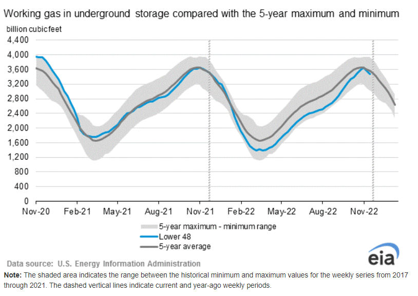 Dane EIA pokazują, że zapasy zmniejszyły się o 81 miliardów stóp sześciennych. Oczekiwano spadku o 84 bcf oraz w poprzednim tygodniu było to 80 mld stóp sześciennych. Jak widać zima nie jest póki co kapryśna, stąd spadek cen i utrzymanie oporu w postaci spadkowej linii trendu .