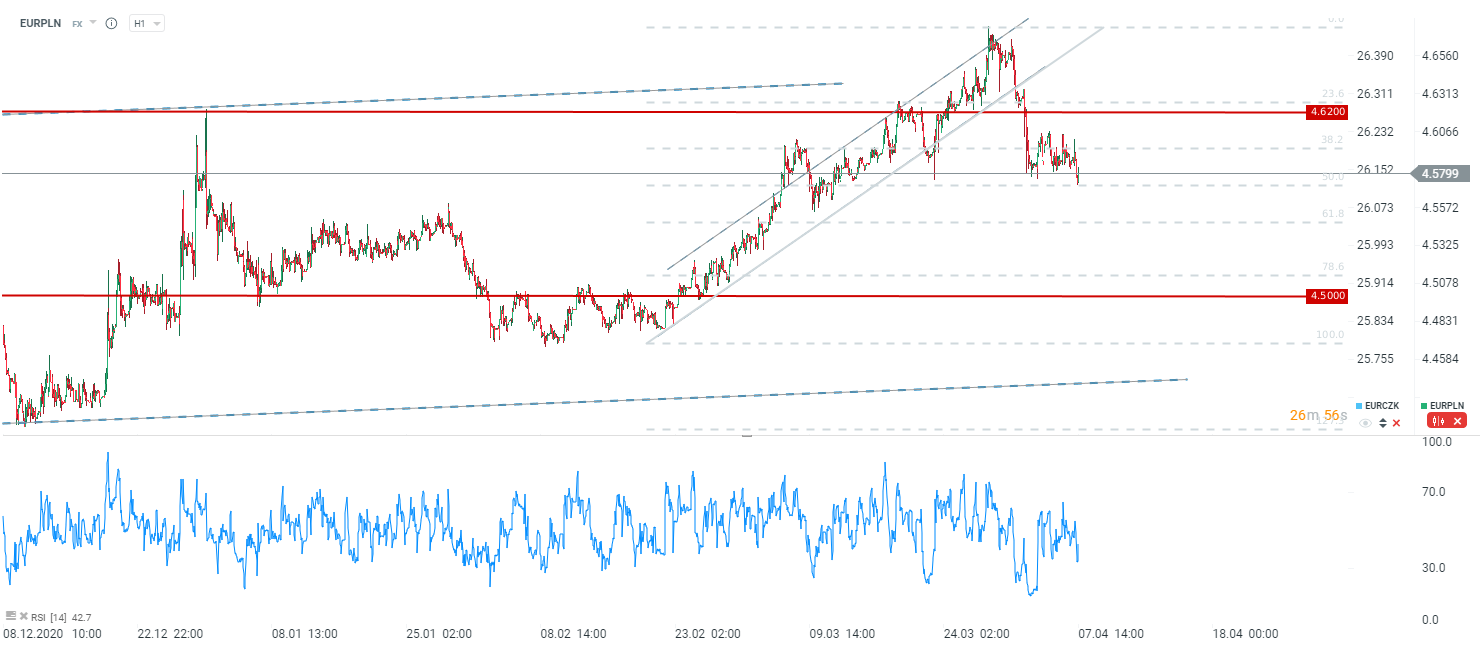 Oprócz tego wcześniej o godzinie 14:00 opublikowane zostały dane dotyczące aktywów rezerowowych. „NBP opublikował 7 kwietnia dane o stanie oficjalnych aktywów rezerwowych. Wynika z nich, że na koniec marca 2021 r. ich stan wyrażony w euro wyniósł 134,8 mld EUR i utrzymał się na zbliżonym poziomie jak na koniec lutego 2021 r. Stan rezerw wyrażony w dolarach zmniejszył się o 5,1 mld USD i osiągnął poziom 158,4 mld USD.” Jak widać rezerwy pozostają na wysokim i stabilnym poziomie i skurczenie się rezerw w ujęciu dolarowym to prawdopodobnie efekt niższych cen złota. Niemniej nie można wykluczyć stabilizacji złotego, ze względu na czynnik powiązany z możliwym przewalutowaniem kredytów w polskim systemie bankowym.