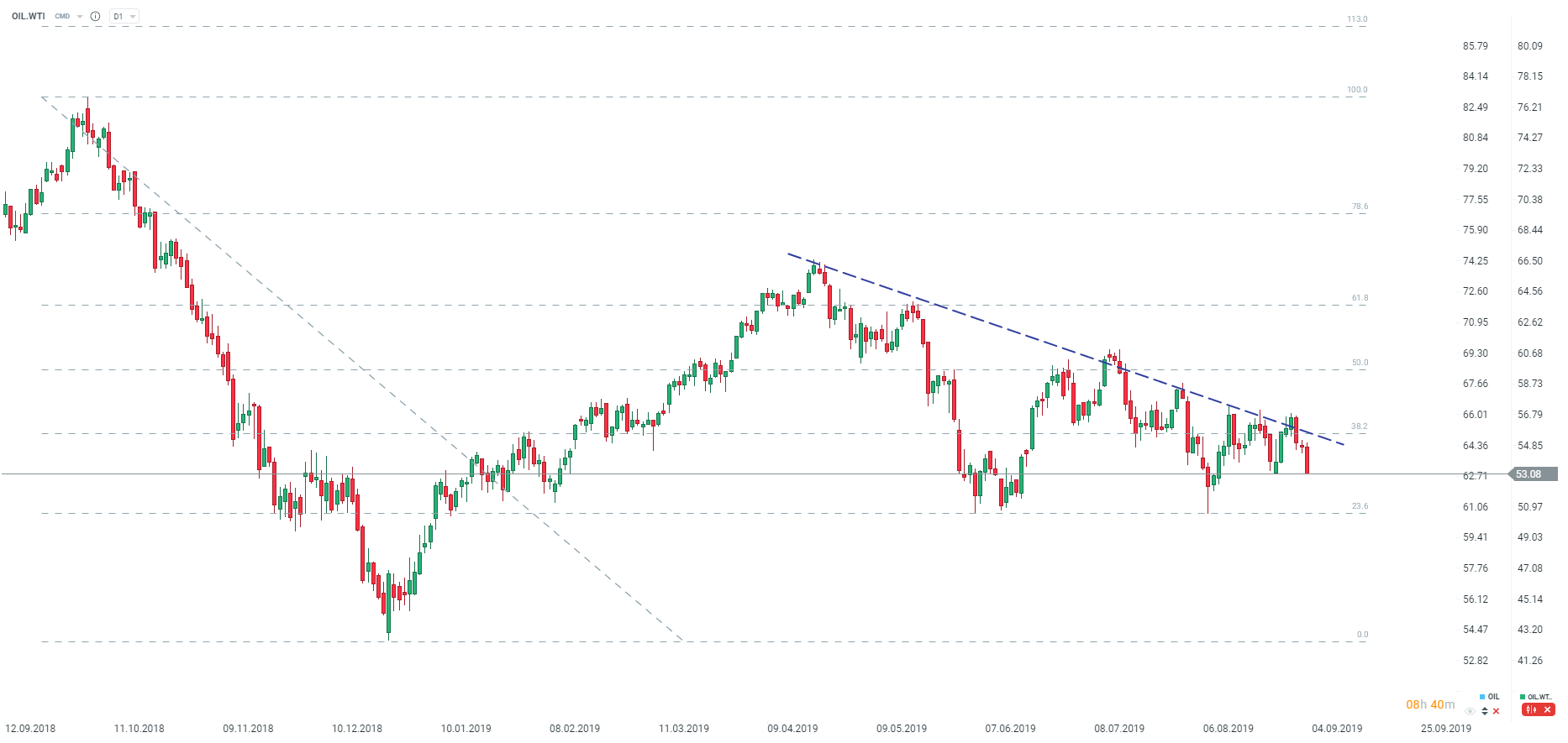 Ropa naftowa cofa się na nowe dzienne minima testując ostatnie lokalne dołki. Źródło: xStation5