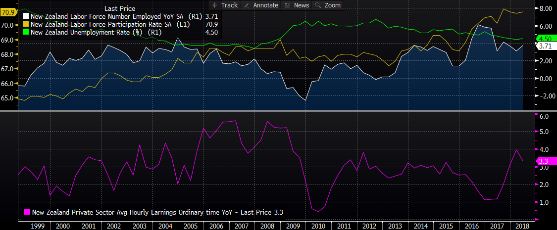 Rynek pracy w Nowej Zelandii wydaje się nie odzwierciedlać żadnych niepokojących sygnałów i powinien działać na korzyść dolara nowozelandzkiego. Źródło: Bloomberg