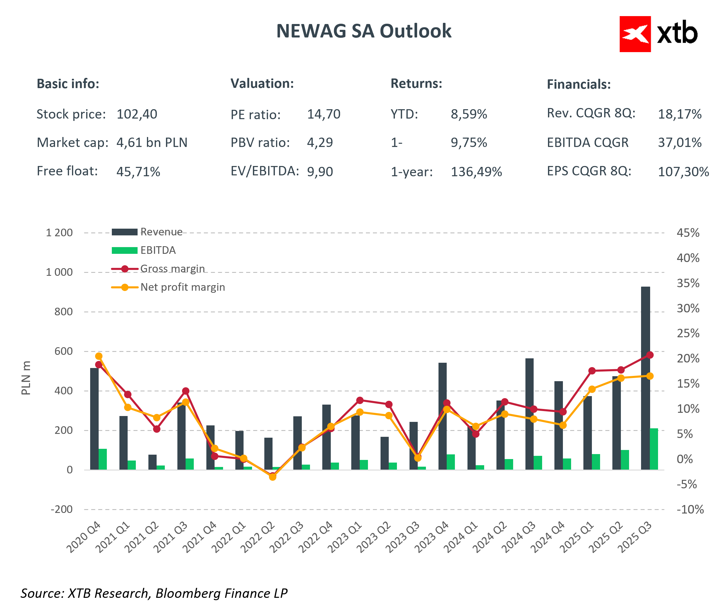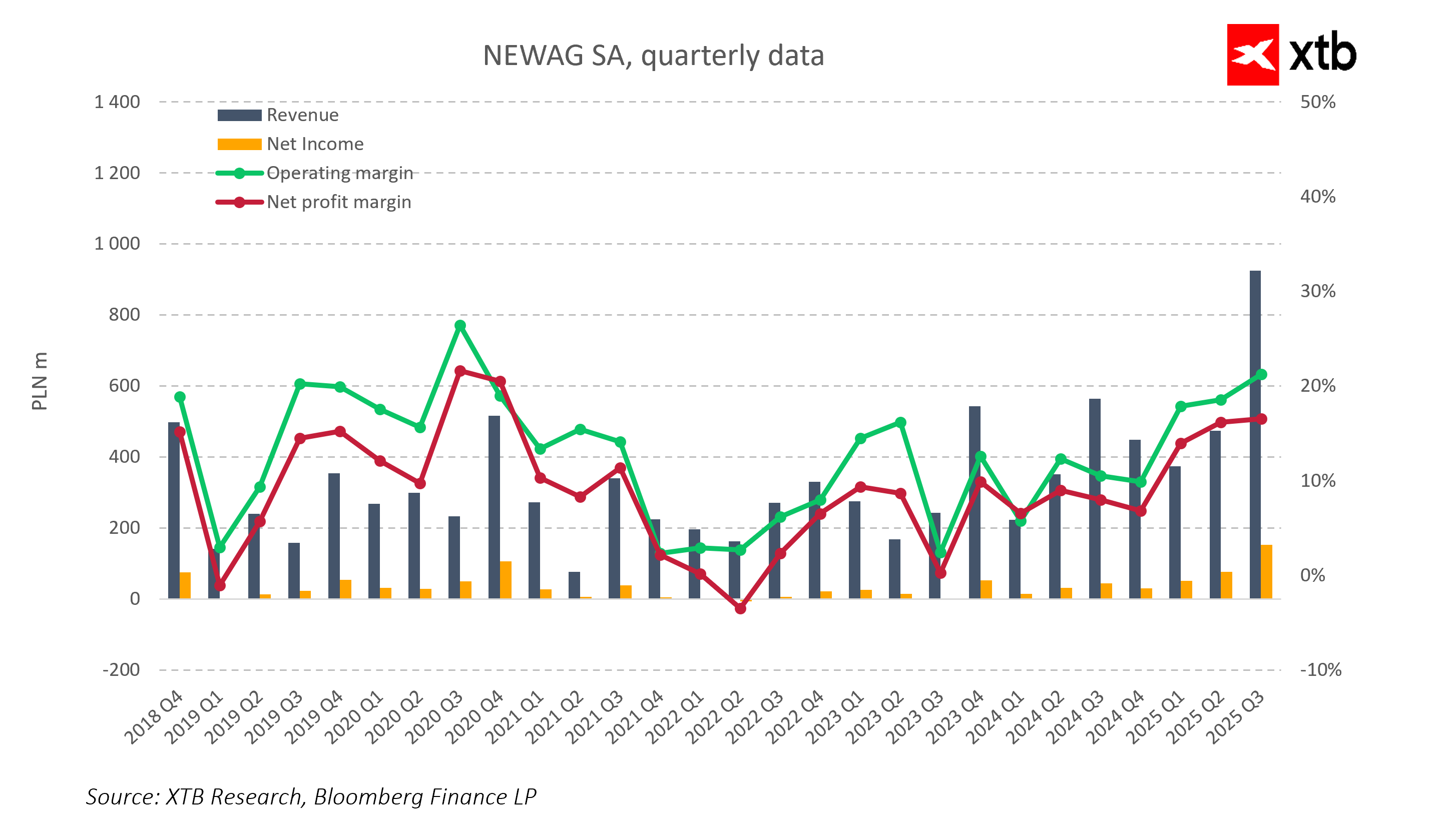 Mimo że realizacja tak ambitnego harmonogramu dostaw wiąże się z wyzwaniami operacyjnymi, a kwestie regulacyjne pozostają elementem ryzyka, obecne momentum rynkowe wyraźnie sprzyja Newagowi. Spółka coraz wyraźniej wyrasta na krajowego championa w segmencie taboru szynowego, korzystającego z długoterminowego trendu modernizacji kolei i strukturalnych inwestycji infrastrukturalnych.
