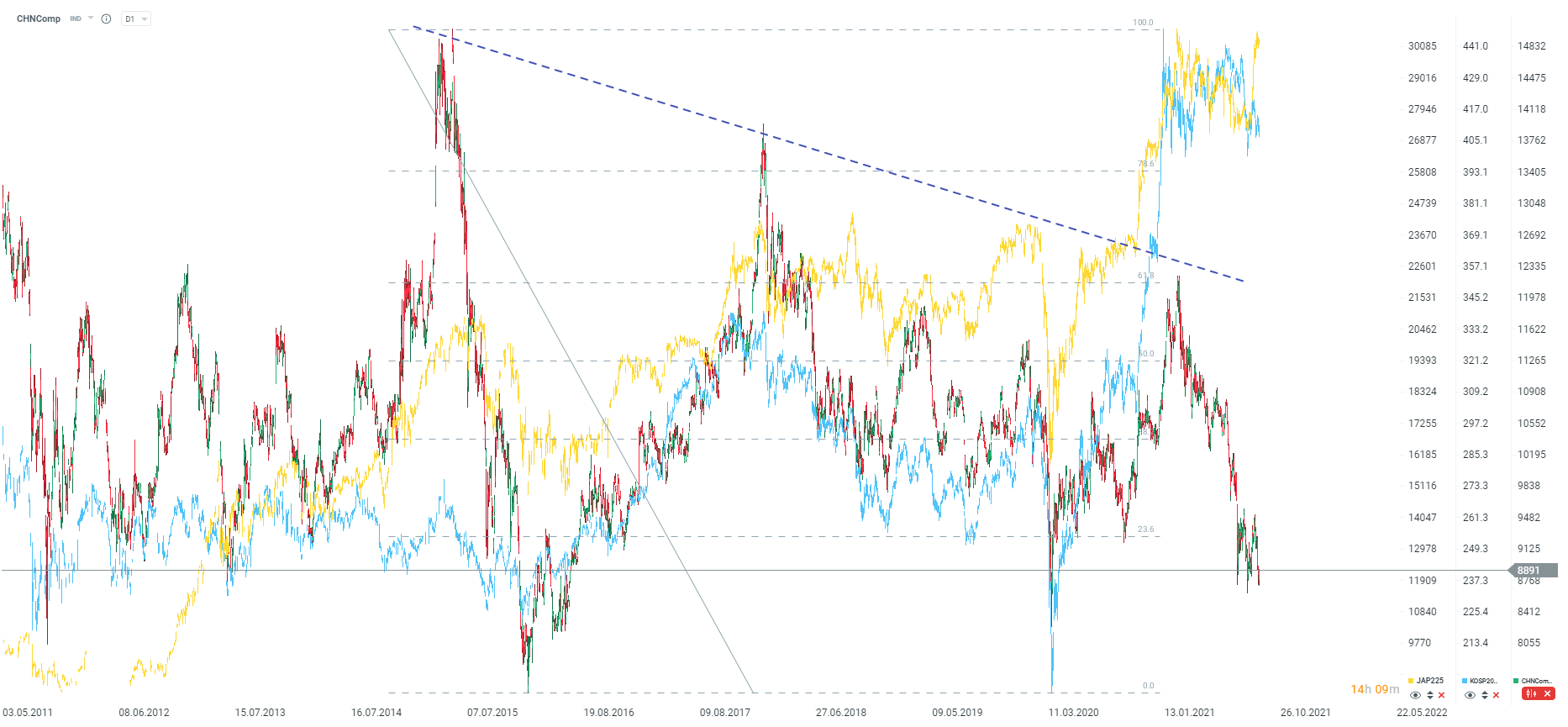 Jak widać chiński rynek od dłuższego czasu znajduje się w totalnym odwrocie w porównaniu do innych rynków azjatyckich. CHNComp znajduje się 7% od dołka z marca zeszłego roku oraz 15% od dołka z 2015 roku. Źródło: xStation5