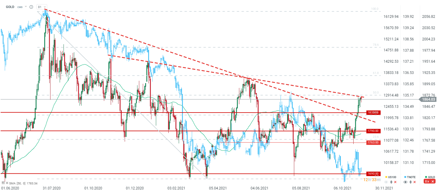 Złoto rozpoczęło dzisiejszą sesję z niewielką luką wzrostową, blisko poziomu 1870 USD za uncję, który był najwyższy od czerwca. Jednocześnie warto zwrócić uwagę, że jest to okolica zdeterminowana przez linię trendu spadkowego wyznaczonego po 3 poprzednich lokalnych wysokich szczytach z ostatnich 12 miesięcy. Nieco powyżej znajduje się kluczowy poziom obrony niedźwiedzi, czyli zniesienie 50.0 całego ruchu spadkowego od historycznych szczytów z zeszłego roku.