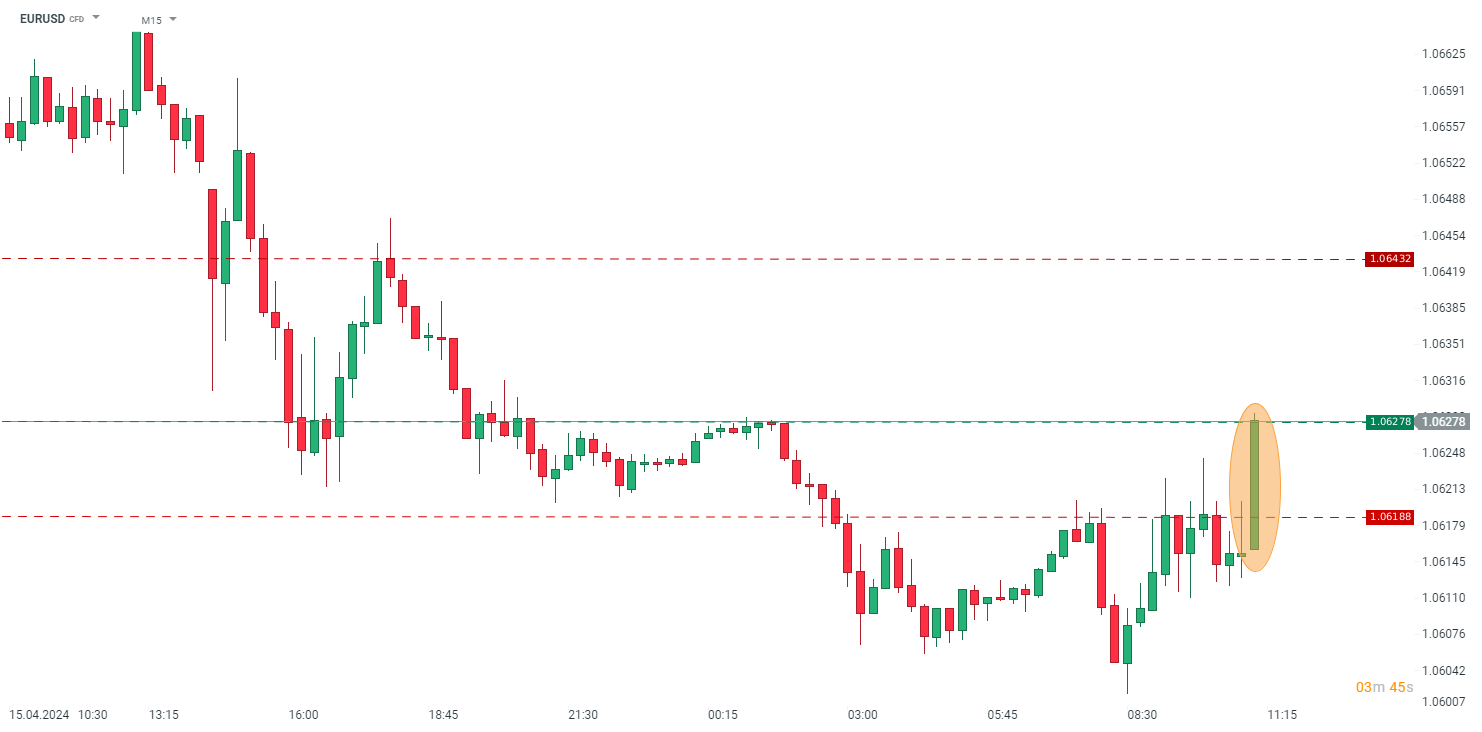 W reakcji na dane dotyczące indeksu nastrojów ZEW mocne odbicie zanotowało euro. Kontrakt na kurs waluty do dolara testuje kluczowe poziomy oporu z wczorajszego dnia. Źródło: xStation