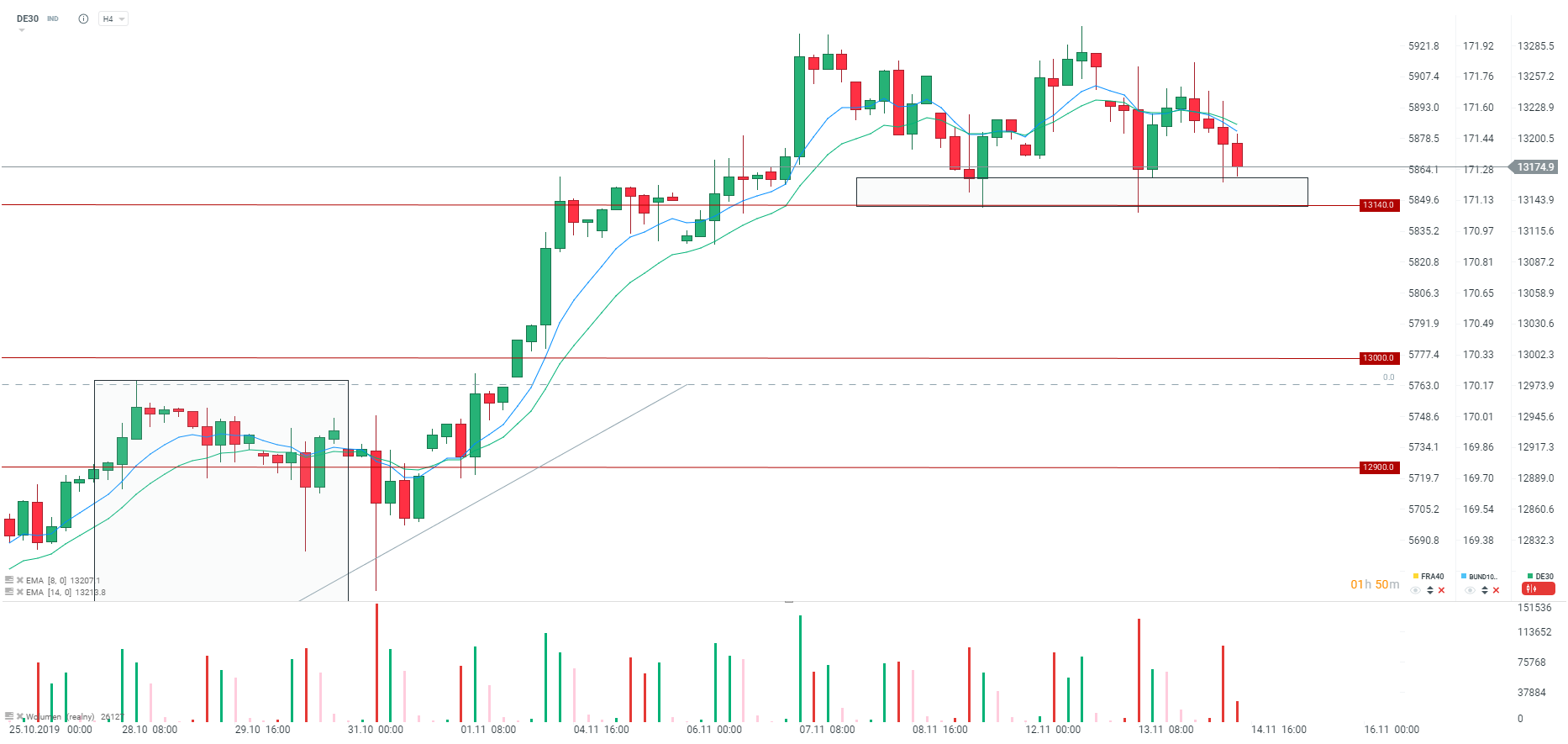 Olaf Scholz, minister finansów Niemiec powiedział właśnie, że Niemcy nie potrzebują dodatkowej stymulacji fiskalnej. Te słowa padają po tym, jak dzisiejsze dane dotyczące wzrostu gospodarczego w III kwartale pokazały, że niemiecka gospodarka wzrosła o 0,1% k/k przy oczekiwaniu spadku o 0,1% k/k, co wprowadziłoby Niemcy w recesję techniczną. Słowa ze strony ministra finansów mogą rozwiać nadzieje rynków, że wszechobecne spowolnienie pociągnie za sobą dodatkowe środki fiskalne mające na celu przywrócenie gospodarki na właściwe tory. W zasadzie wcześniej spekulowano, że DAX rośnie głównie w odpowiedzi na możliwe wprowadzenie nowej stymulacji. W tym momencie słowa te mogą zmienić całą sytuację.