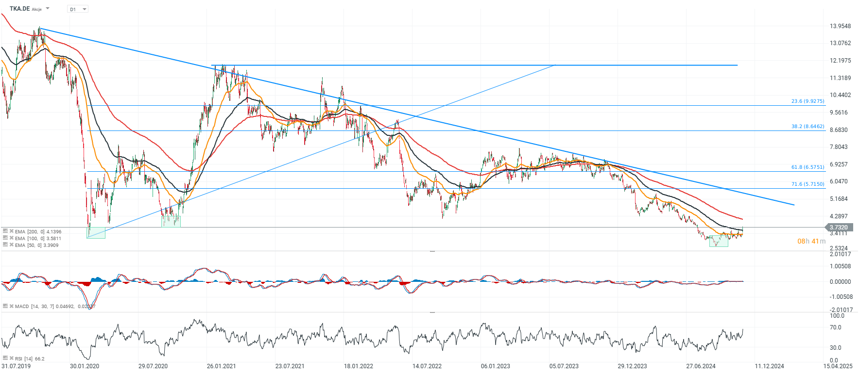 Zakończenie roku fiskalnego dla firmy okazało się lepsze, niż oczekiwano; firma odnotowała wyższy o 32%, od consensusu zysk przed opodatkowaniem (EBIT). Prognozy na rok 2025 okazały się nieznacznie poniżej prognoz (zwłaszcza od strony oczekiwań względem wolnych przepływów pieniężnych), ale rynek zainteresował się walorami firmy, pośrednio dzięki silnym wzrostom Rheinmetall, który jeszcze latem wskazywał, że może dążyć do przejęcia segmentu marynarki wojennej w Thyssenkrupp. Lepsze wyniki firma przypisała sile w sektorze morskim i usług materiałowych, które zrównoważyły firmie słaby wynik Steel Europe.