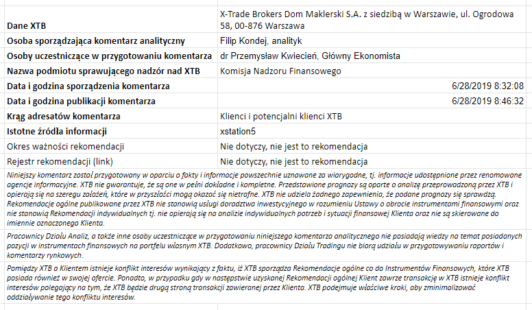 Donald Trump nie czuje presji czasu jeśli chodzi o kwestie związaną z Iranem. Na szczycie G20 w Osace Trump wskazał, że Stany Zjednoczone mają dużo czasu na negocjacje. Przypomnijmy, że napięcia geopolityczne pomiędzy dwoma krajami znacząco wzrosły w ostatnich tygodniach, gdyż Stany Zjednoczone oskarżyły Iran o atak na tankowce, natomiast Iran zestrzelił amerykańskiego drona. Pomimo tej eskalacji, Trump nie zdecydował się na odwet militarny w stosunku do Iranu. Niemniej Iran grozi w tym momencie, że wyjdzie z porozumienia nuklearnego osiągniętego w 2015 roku. Iran nie wskazał wczoraj czy doszło do naruszenia uzgodnionej ilości wzbogacanego uranu. Wobec tego teoretycznie można domniemywać, że nie doszło do naruszenia porozumienia nuklearnego. W odpowiedzi ropa naftowa cofa się. W stosunku do ropy naftowej warto pamiętać o szczycie OPEC, który odbędzie się w najbliższy poniedziałek oraz wtorek.