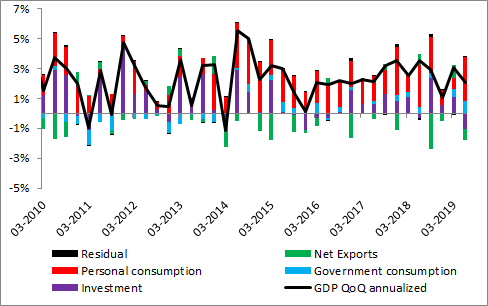 Teoretycznie sytuacja wygląda dobrze. Niezła konsumpcja nie daje podstaw do większego cięcia stóp procentowych. Z drugiej strony inwestycje biznesowe oraz dalsza słabość na rynku nieruchomości mogą powodować spore obawy rynkowe. Co więcej, pomimo działań handlowych ze strony Trumpa, handel nie przynosi pozytywnej kontrybucji do wzrostu.