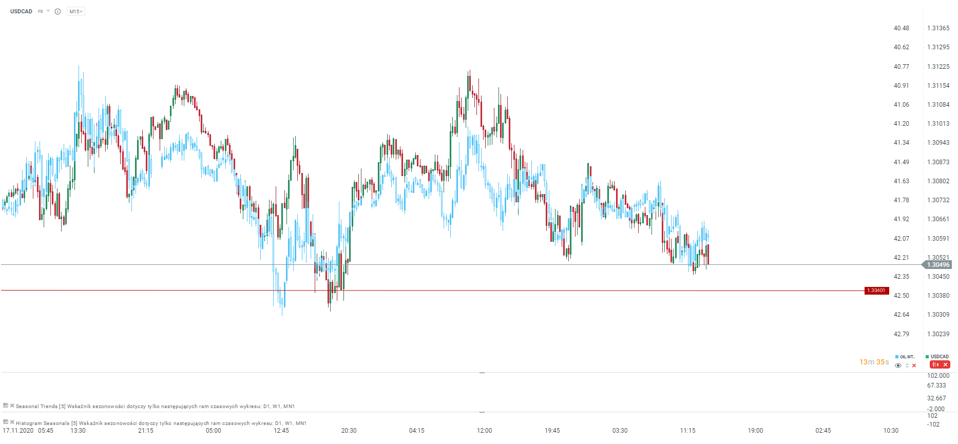 Dzisiejsze ważniejsze popołudniowe dane dotyczą sprzedaży detalicznej w Kanadzie. Sprzedaż rośnie o 1,1% m/m przy oczekiwaniu 0,2% m/m oraz przy poprzednim odczycie 0,4% m/m. Z kolei bazowa rośnie o 1,0% m/m przy oczekiwaniu 0,2% m/m oraz przy poprzednim poziomie 0,5% m/m. Niemniej warto zauważyć, że dane te dotyczą września, kiedy sytuacja pod względem koronawirusa nie była tak zła jak w październiku czy obecnie. Mimo wszystko CAD umacnia się lekko po publikacji, przebijając poziom 1,3050 na parze USDCAD. Widać jednak, że kluczowym czynnikiem dla pary pozostaje ropa oraz również perspektywa dolara amerykańskiego, który również z kolei jest sam kluczowy dla ropy.