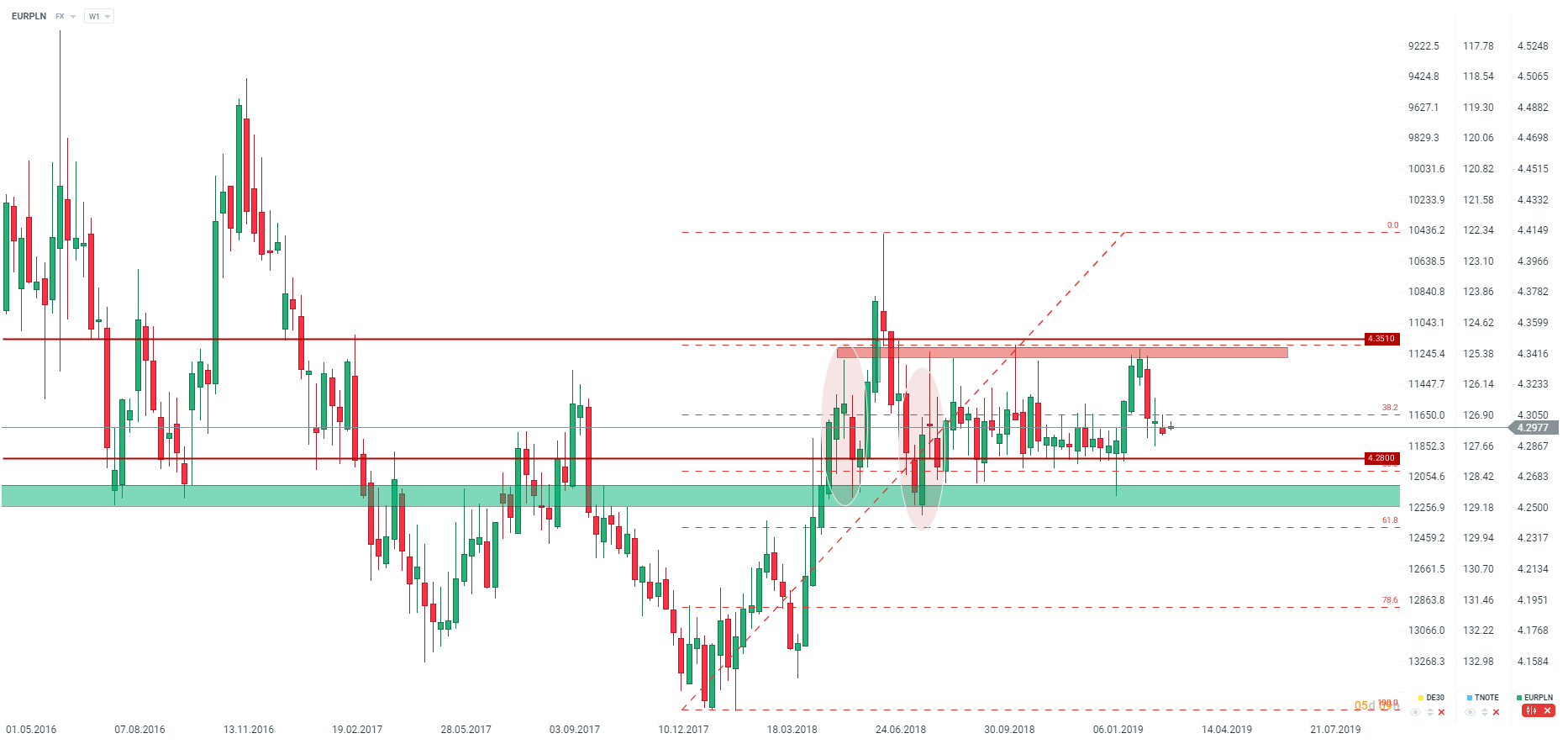 Na parze EURPLN już trzeci tydzień z rzędu mamy do czynienia z niepewnością. Para spadła poniżej kluczowego wsparcia 4,3000/4,3050, ale znajduje się jeszcze daleko od kolejnego ważnego poziomu 4,2800. Źródło: xStation5
