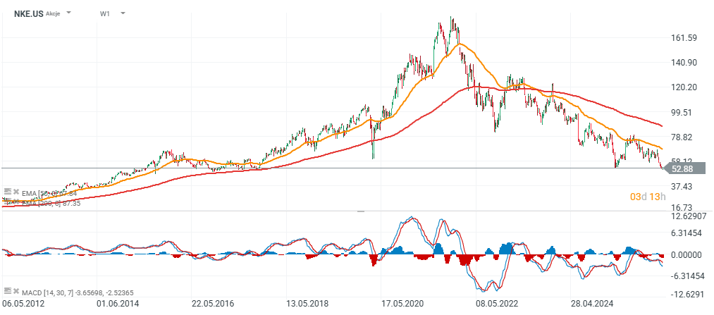 - Sprzedaż w Wielkich Chinach spada i będzie ciążyć spółce. Przychody w kwartale spadły o 10% r/r, sprzedaż hurtowa o -13%, a sprzedaż w Nike Digital aż o -21%. Co więcej, spółka oczekuje -20% spadku przychodów w regionie. Zarząd nie kryje, że w Chinach odbicie może się nie odbyć szybko, a to niepokojące, bo Chiny były historycznie jednym z kluczowych motorów wzrostu Nike.