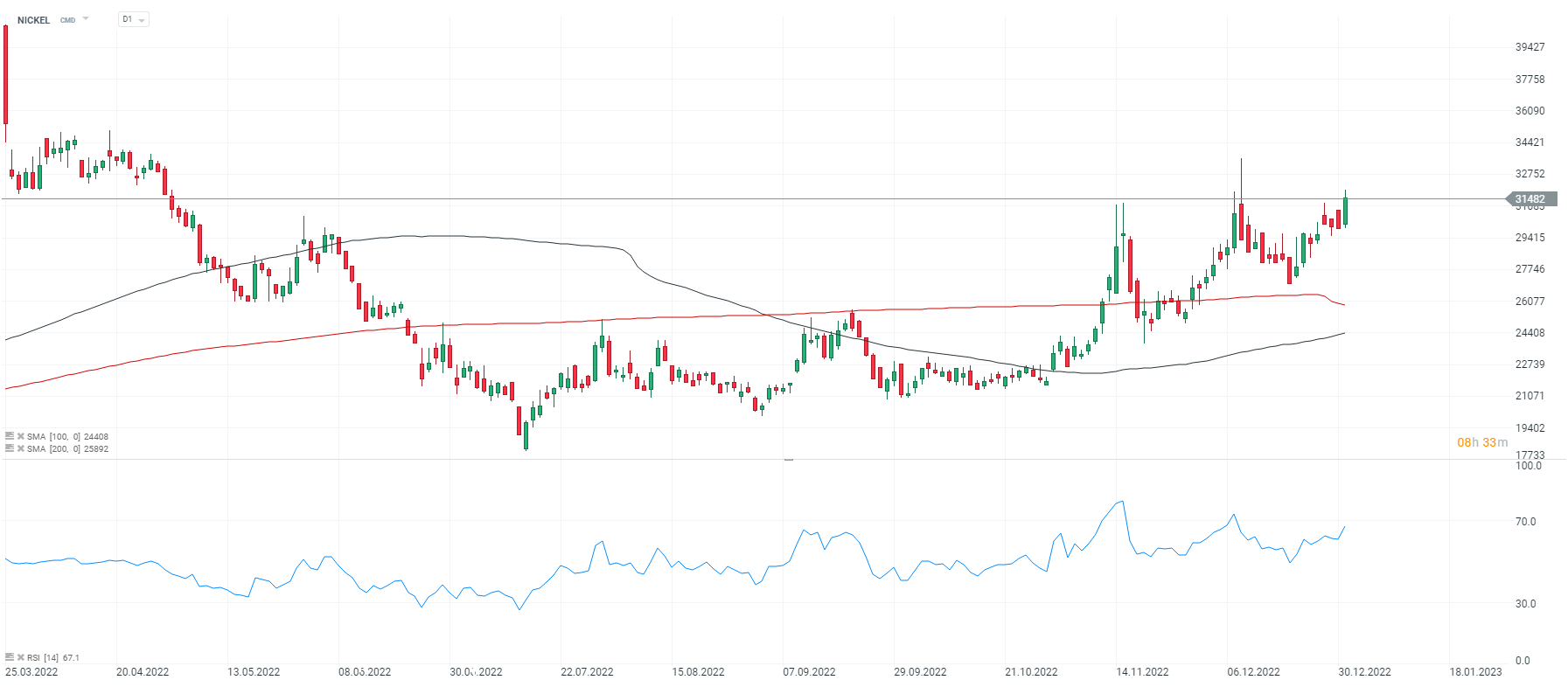 Ceny niklu na Londyńskiej Giełdzie Metali (LME) ponownie dziś rosną do poziomów najwyższych od ostatnich blisko trzech tygodni (od 8 grudnia) ponieważ inwestorzy oczekują, że duża, krótka pozycja zapadająca w styczniu zostanie zlikwidowana, co potencjalnie wesprze byki. Dane codziennie zbierane i publikowane przez LME z jednodniowym opóźnieniem pokazują, że jeden fundusz posiada olbrzymią krótką pozycję wielkości 20-29% całkowitego 'open interest' kontraktów na nikiel, przy czym kontrakty te mają zostać rozliczone w styczniu. Kingdom Futures Chief Executive, Malcolm Freeman w swojej najnowsze notatce poinformował, że rynek niklu oczekuje kolejnego znaczącego wydarzenia w postaci rozliczenia wspomnianej otwartej krótkiej pozycji opiewającej na 23,400 ton metrycznych surrowca, w opinii Freemana podmiot posiada nawet 30% wszystkich kontraktów na nikiel. W swojej notatce Freeman odniósł się również się do olbrzymich wzrostów cen niklu w marcu, gdy wybiły rekordowy poziom powyżej 100.000 USD za tonę metryczną w obrocie pozagiełdowym, co skłoniło LME do zawieszenia handlu niklem na ponad tydzień. W grudniu, ceny niklu zyskiwały pozosawiając prognozy na I kw. 2023 bardziej bycze. Choć wolumeny są jeszcze stabilne, kontrakty niklu są historycznie zmienne i pokazały to w 2022 roku. Spekulacyjny rajd cen może wspierać ograniczenie produkcji przez jednego z największych światowych producentów, rosyjskiego Norilsk Nickel. Firma informowała o planowanych cięciach produkcji.