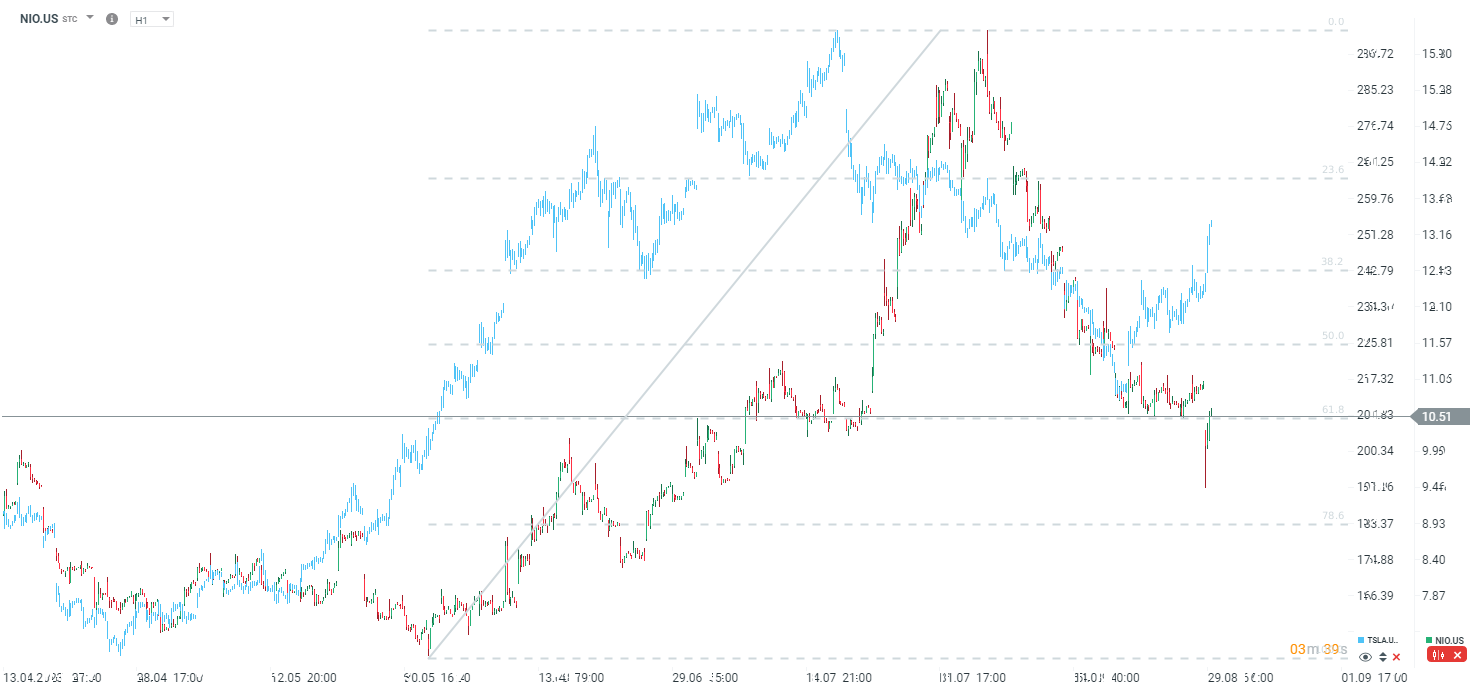 NIO – chiński start-up, producent samochodów elektrycznych poinformował o gorszych wynikach za II kwartał niż oczekiwano. Akcje spółki zaliczyły głębokie cofnięcie na otwarciu w USA, ale jednocześnie obiecujące informacje dotyczące trzeciego kwartału pozwalają na ograniczenie początkowych strat. Dane NIO: